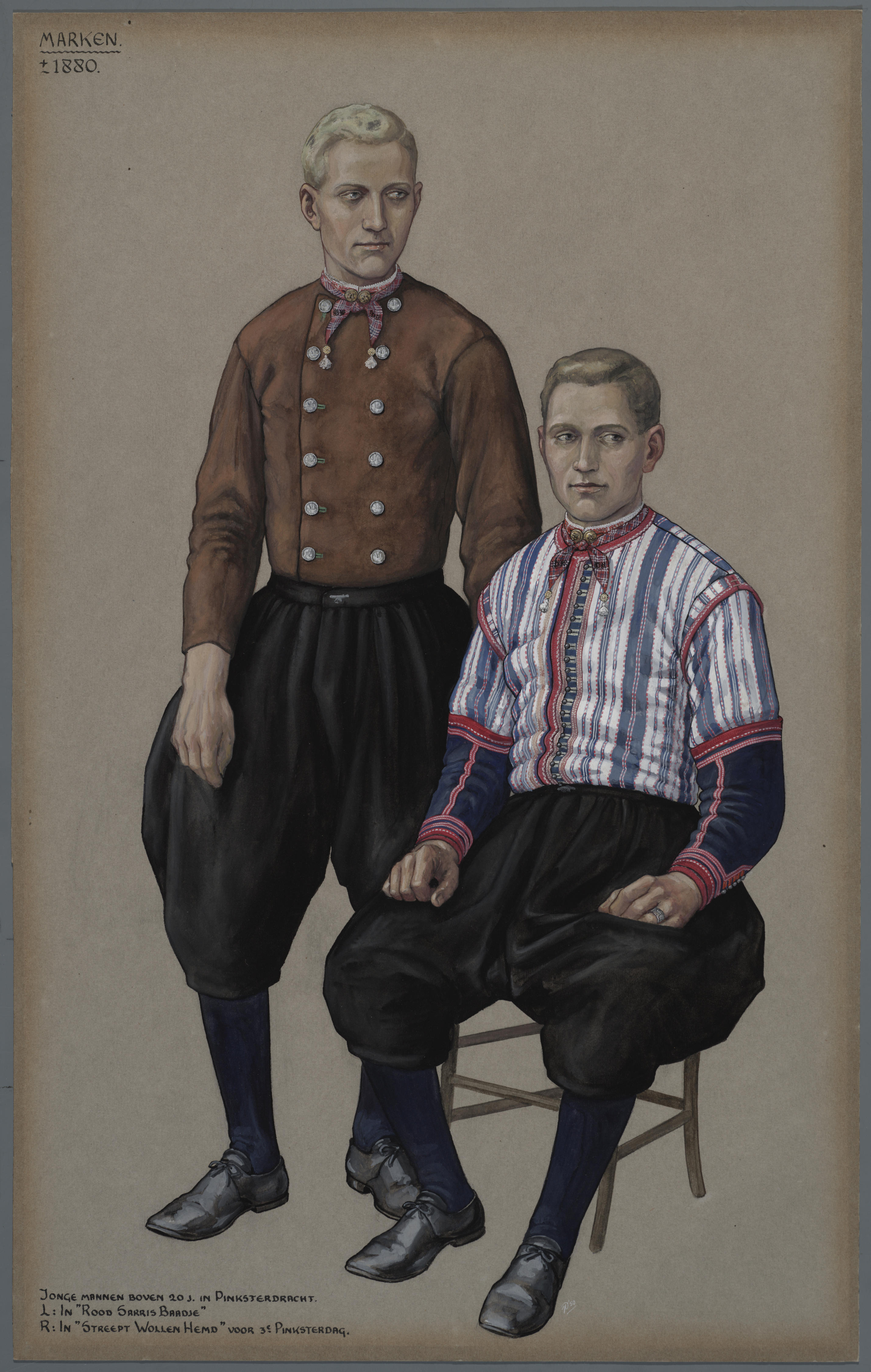 Twee mannen in pinksterdracht, Marken circa 1880