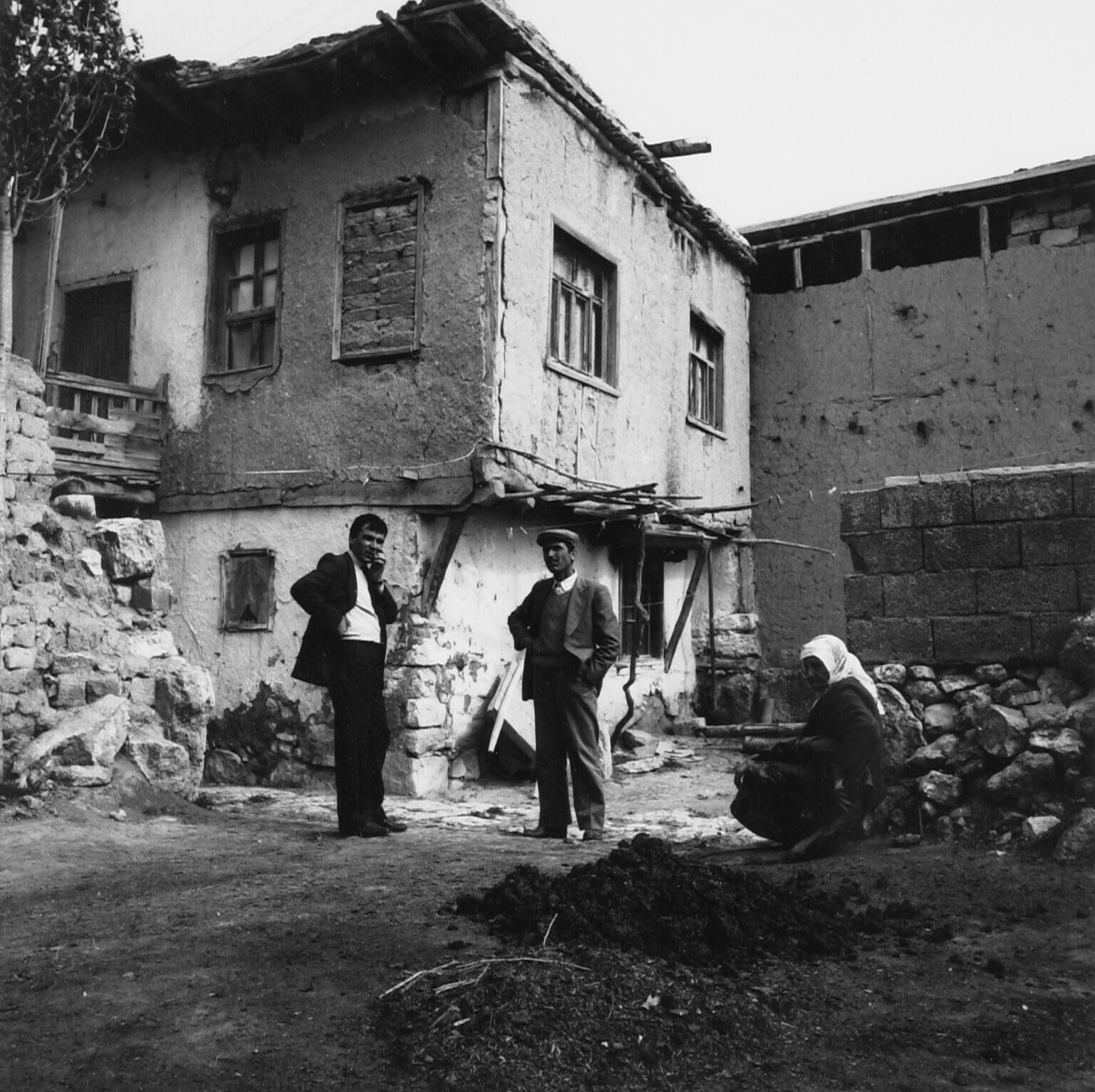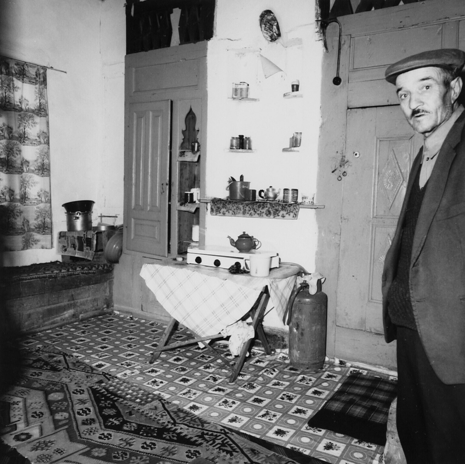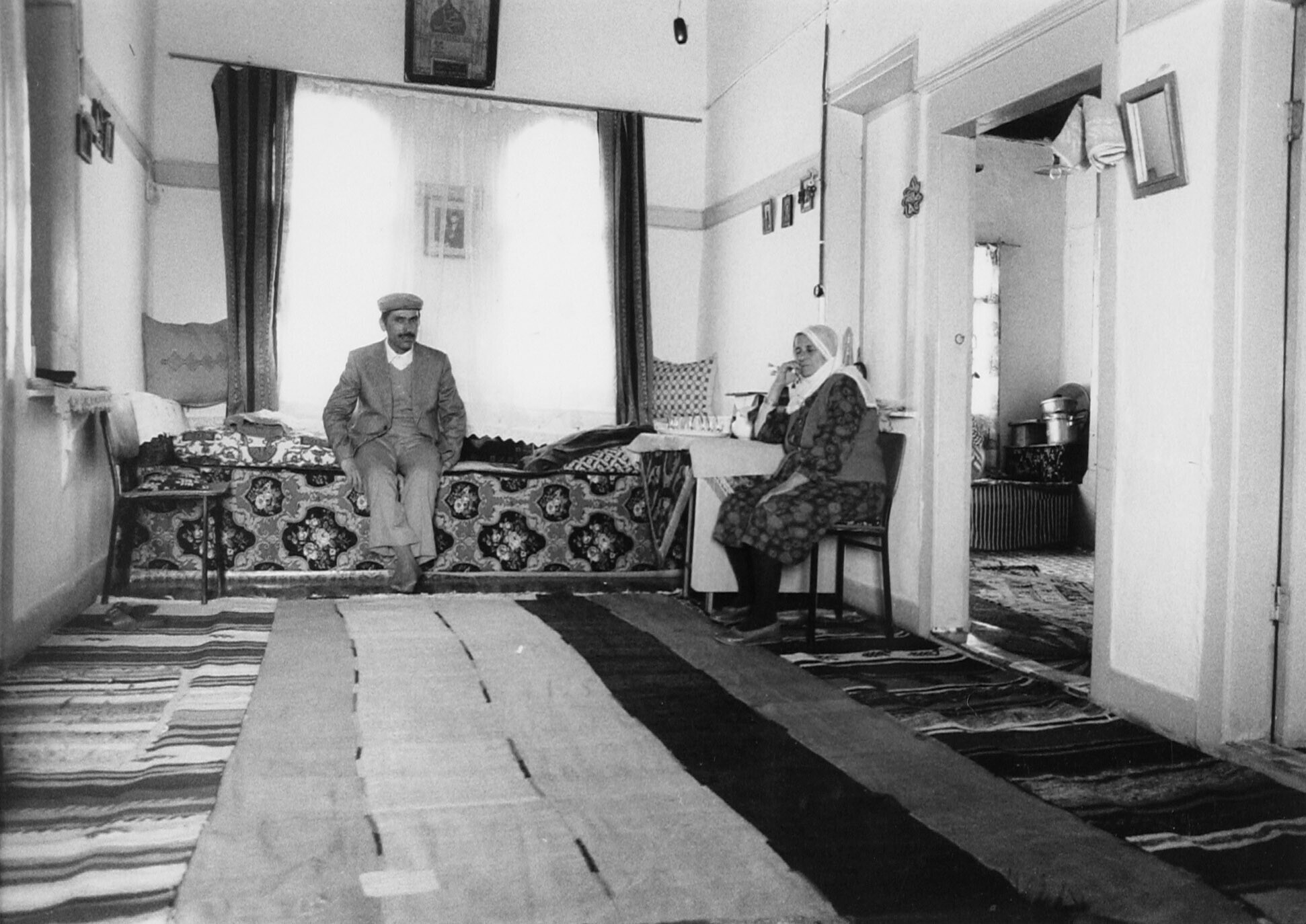 Boer en boerin op hun erf met een Turkse bezoeker, d...