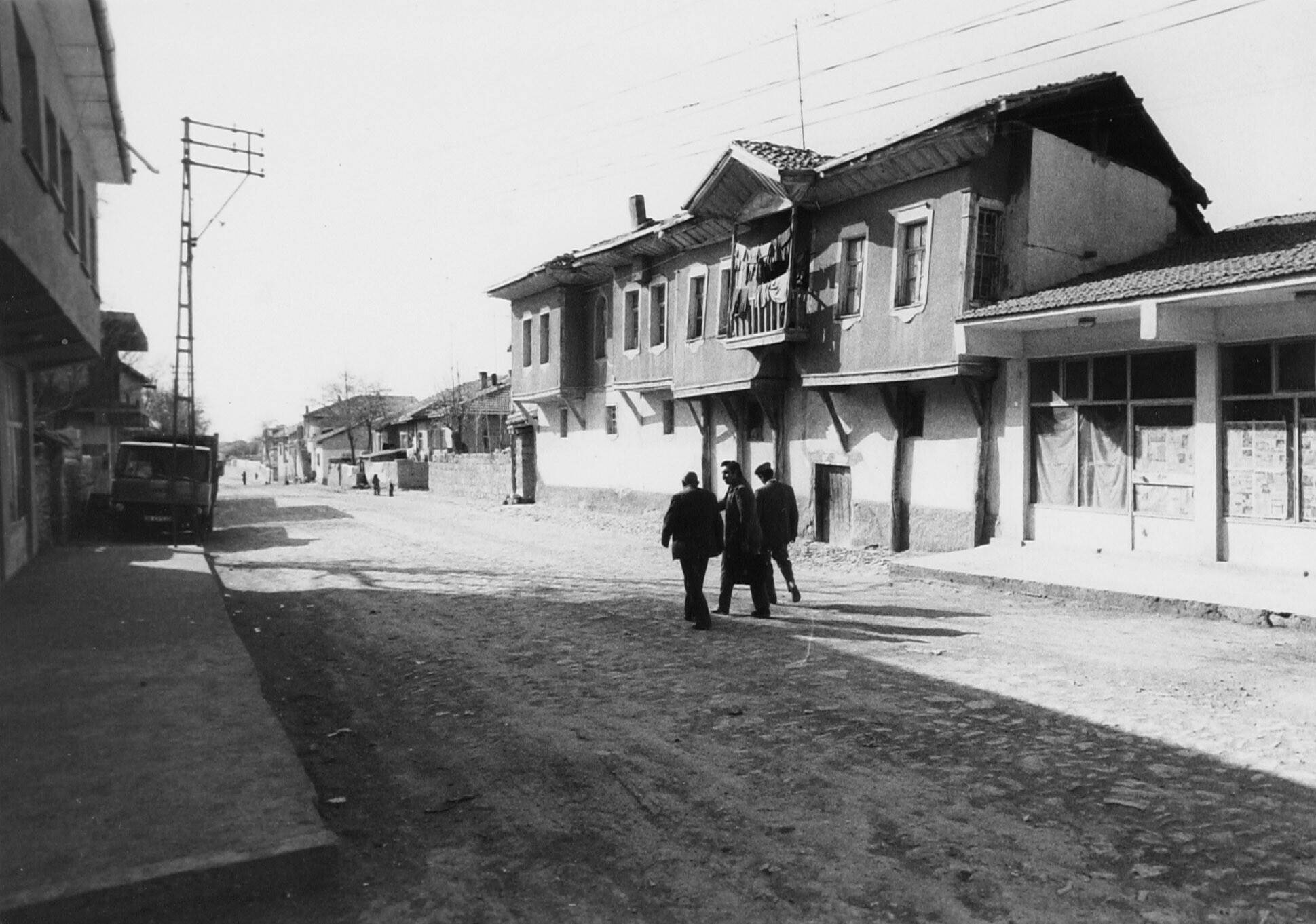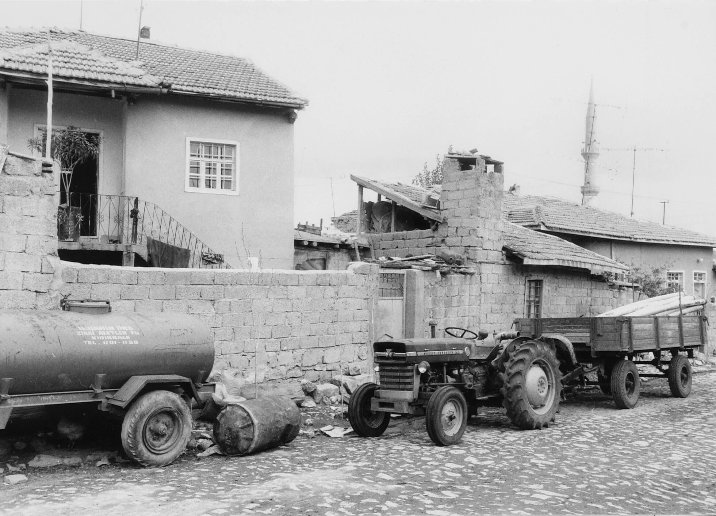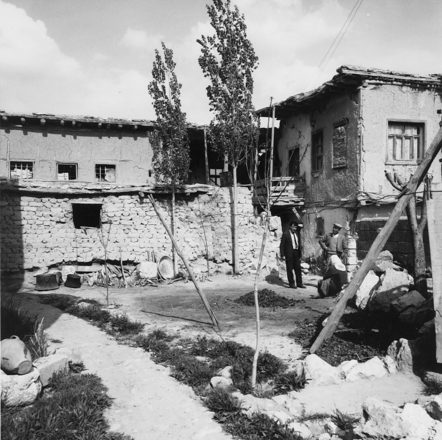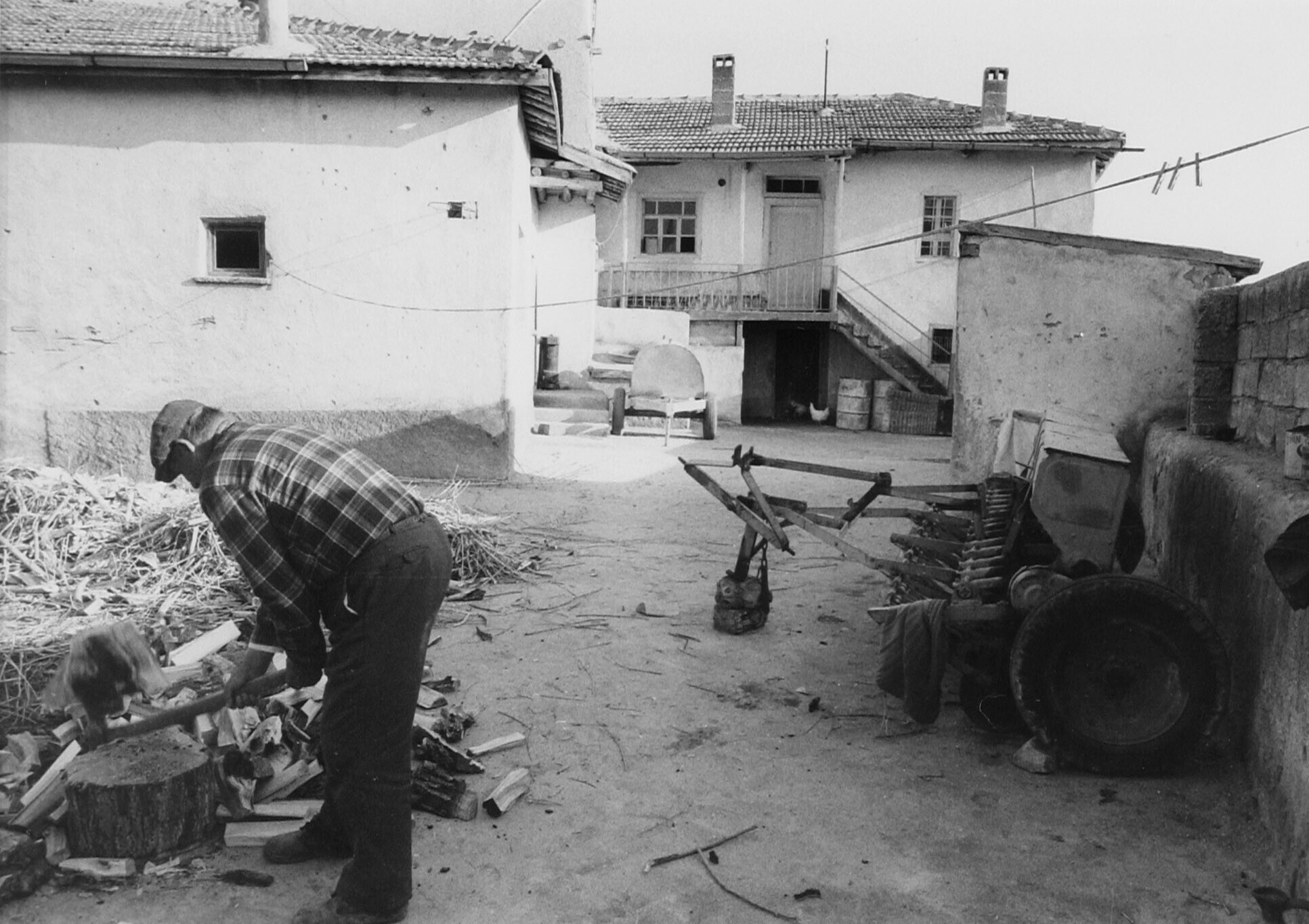 Boer en boerin op hun erf met een Turkse bezoeker, d...