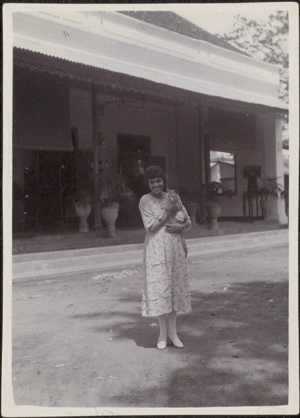Vrouw met een kat voor de voorgalerij van een pension