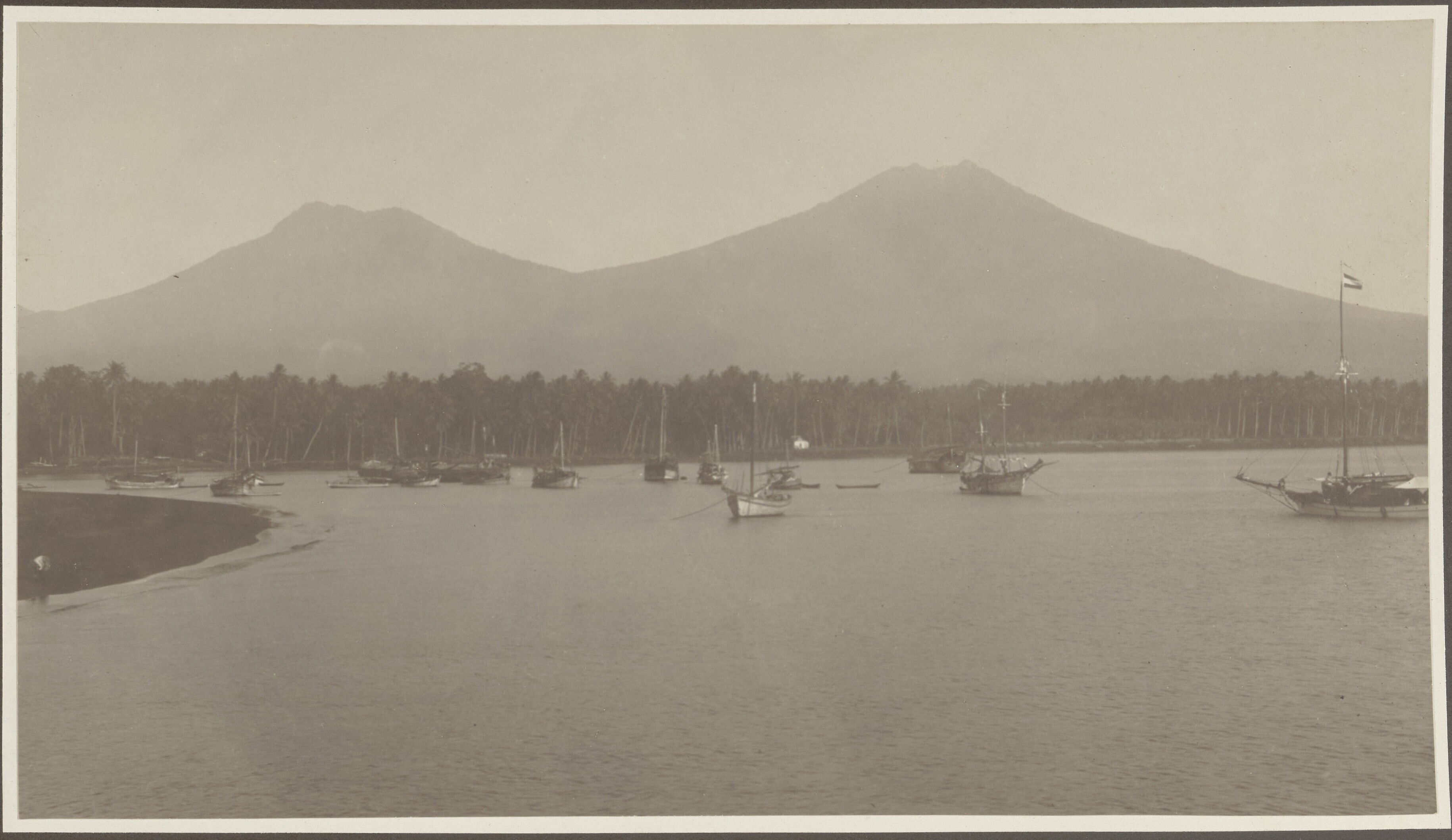 Strandgezicht met prauwen voor anker bij Banjoewangi...
