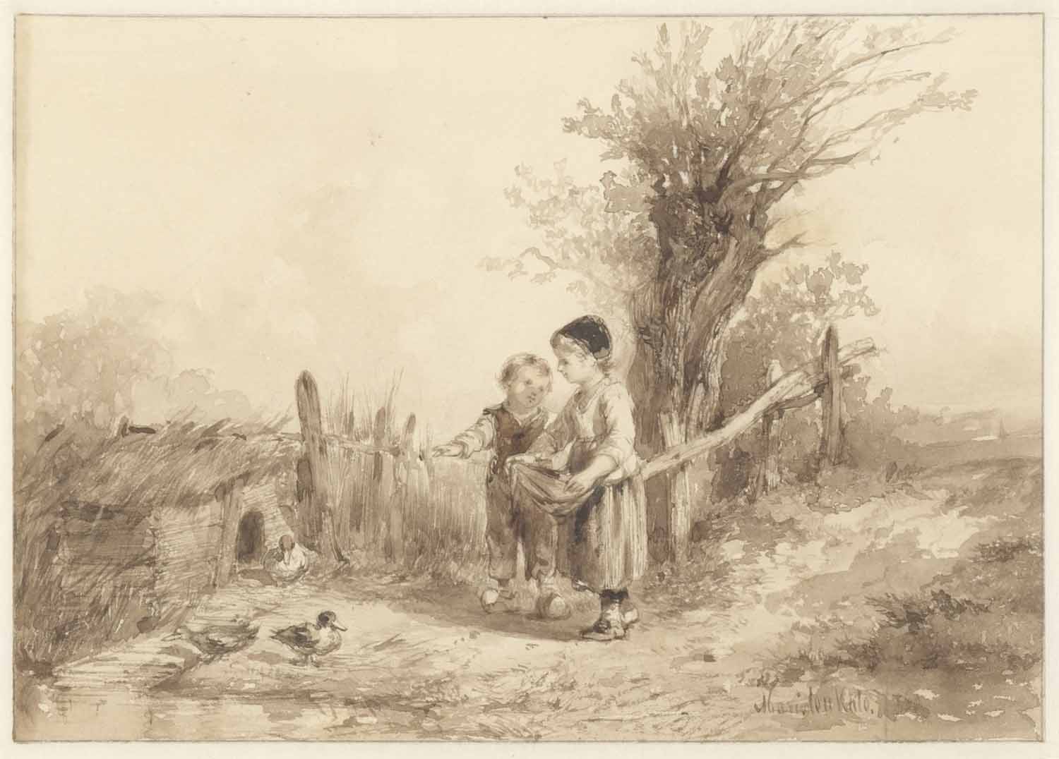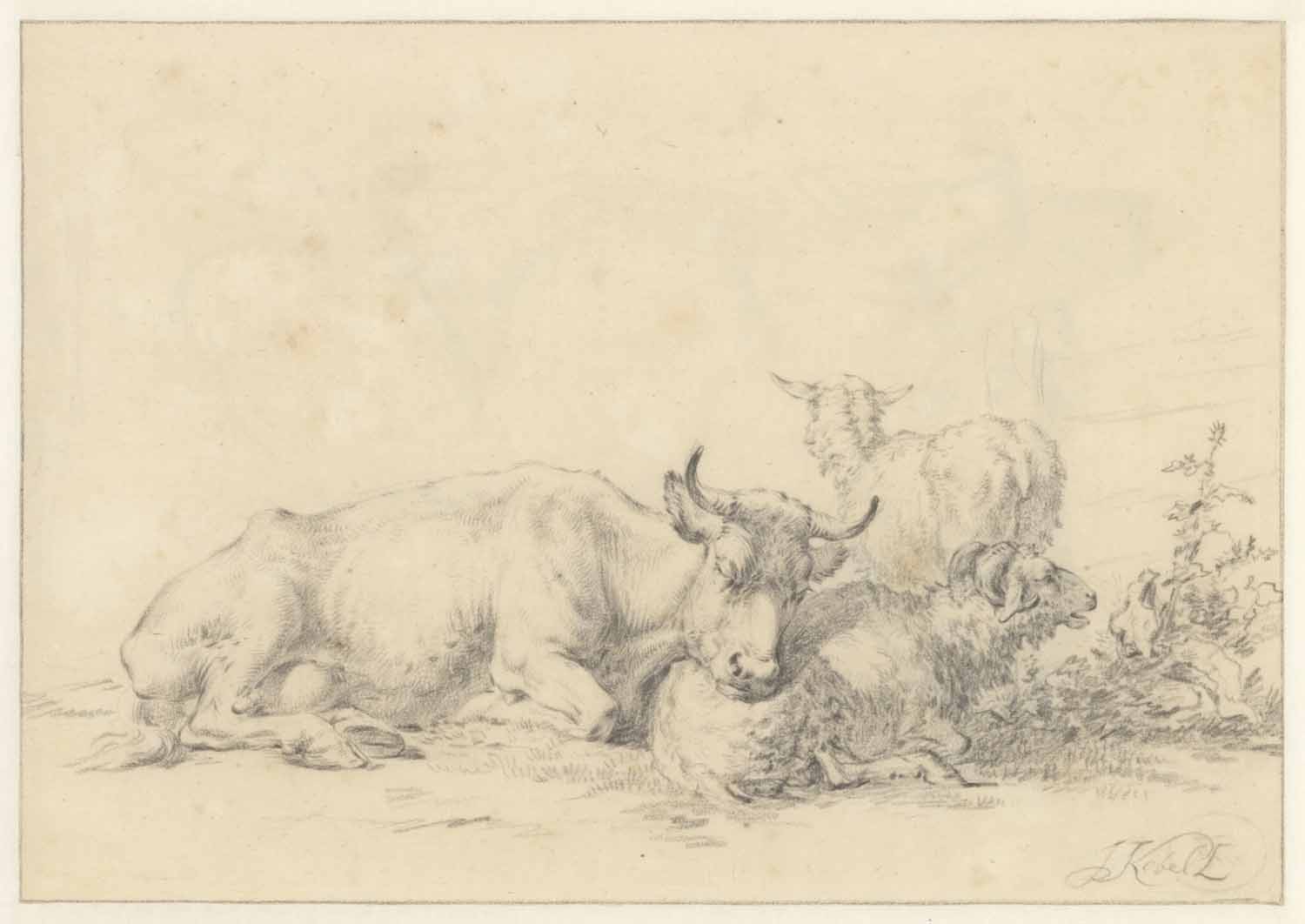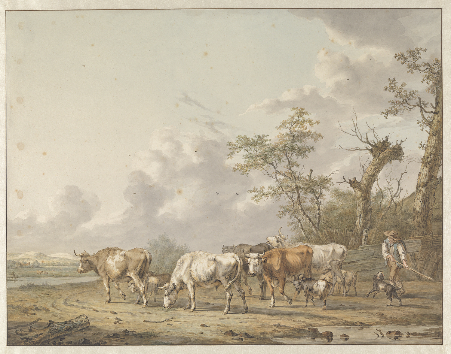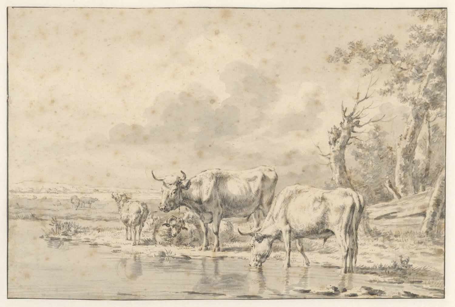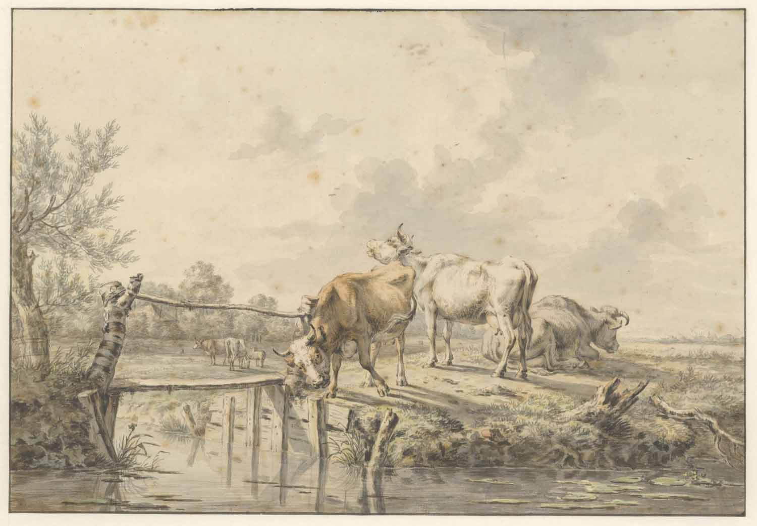 Eene weide met vee, eene koe schuurt zich tegen eene...