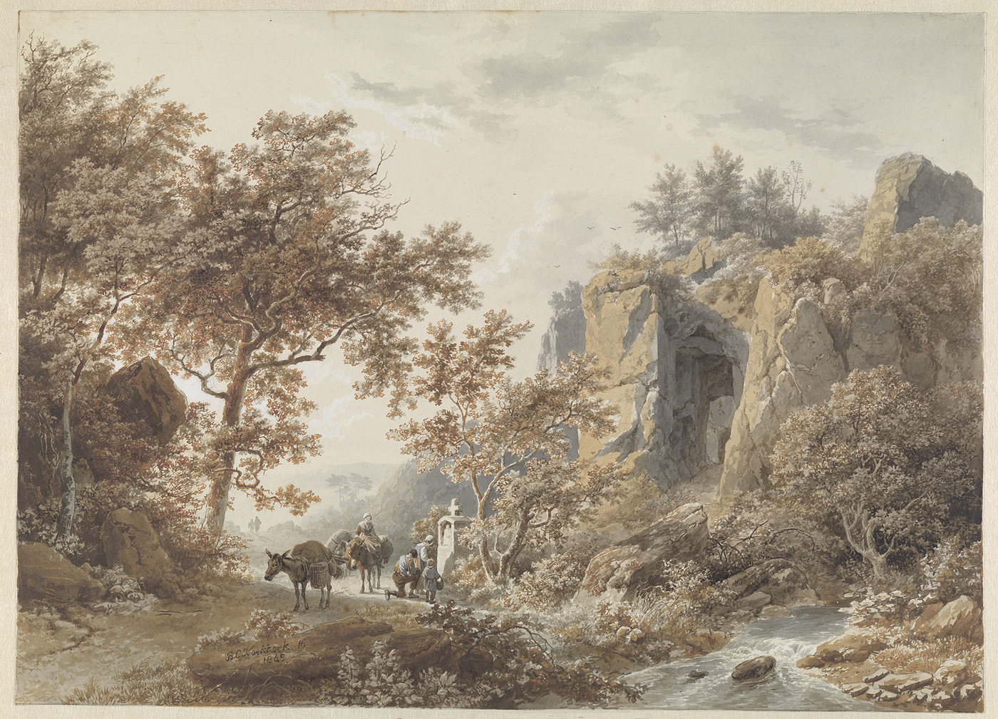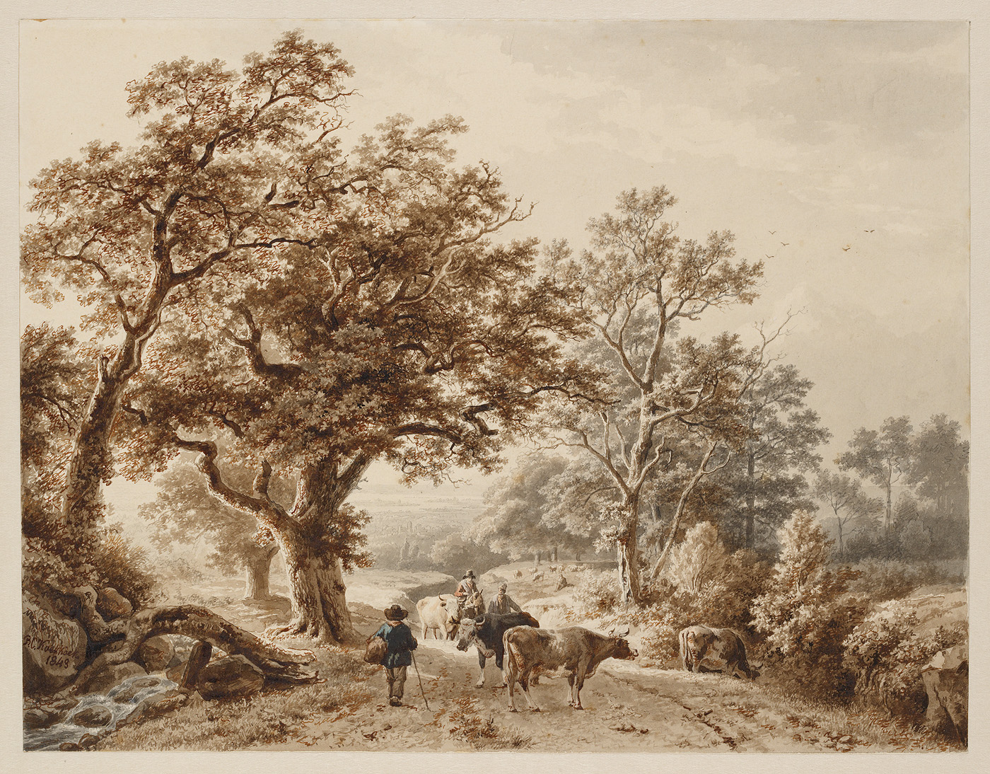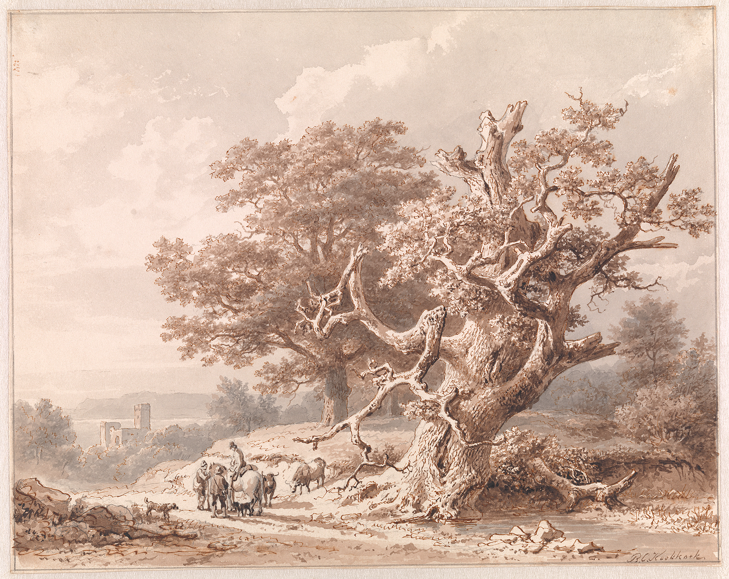 Een landschap met zwaar eikenhout gestoffeerd met ve...