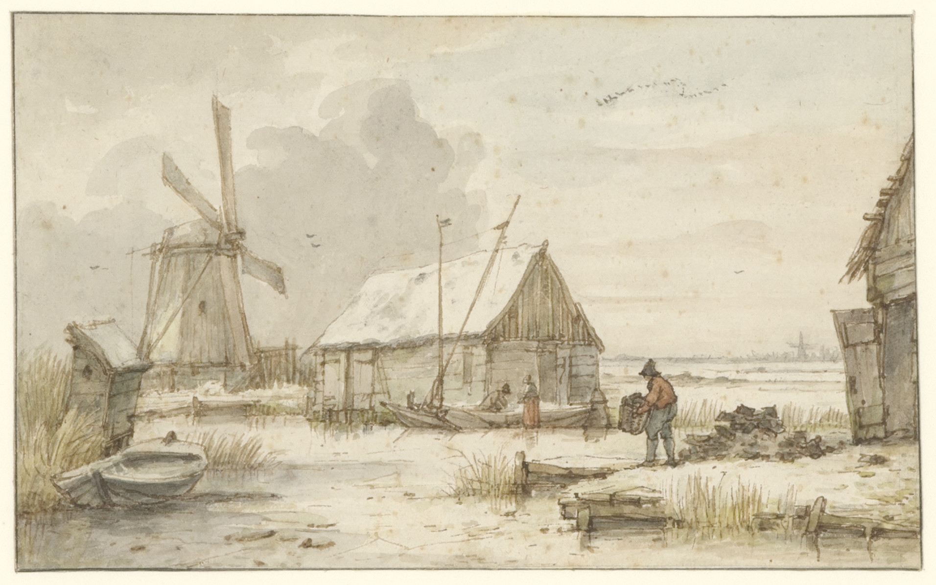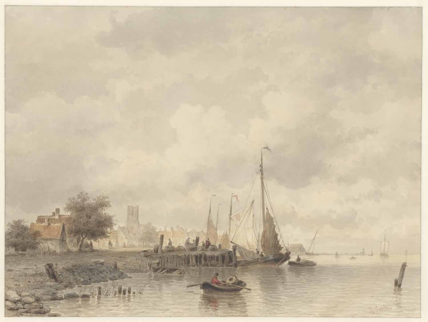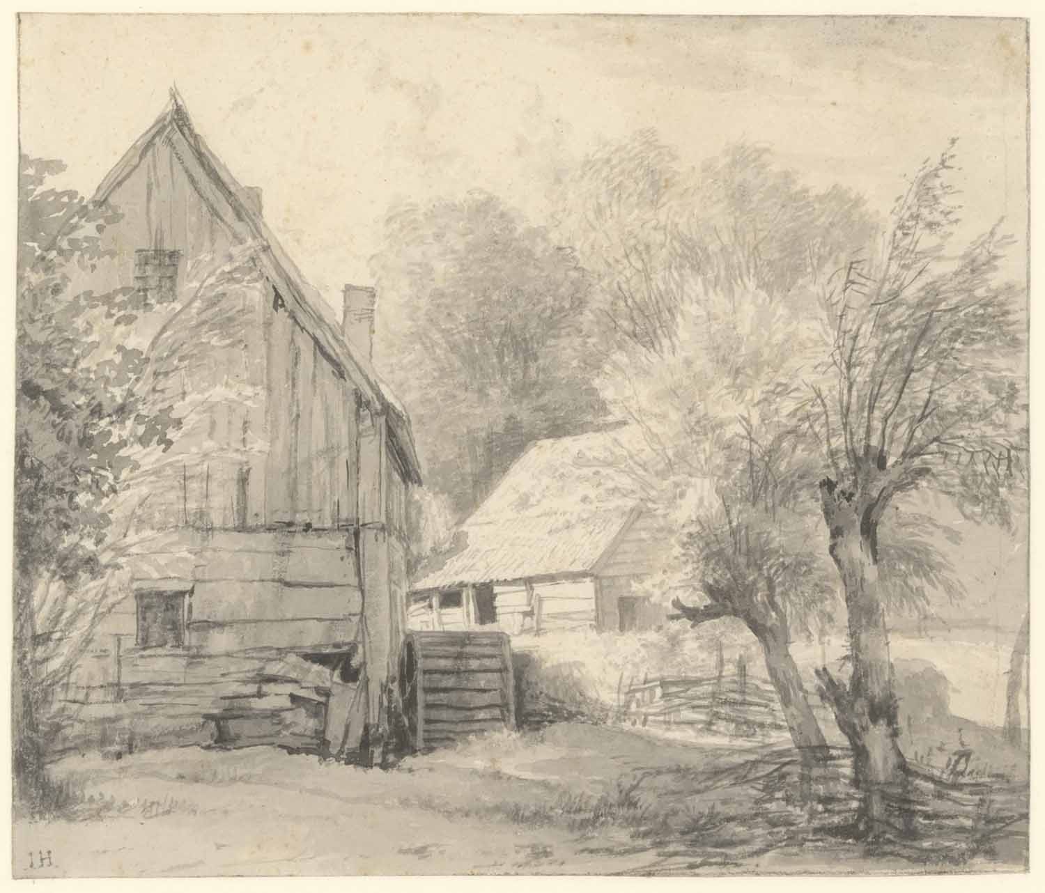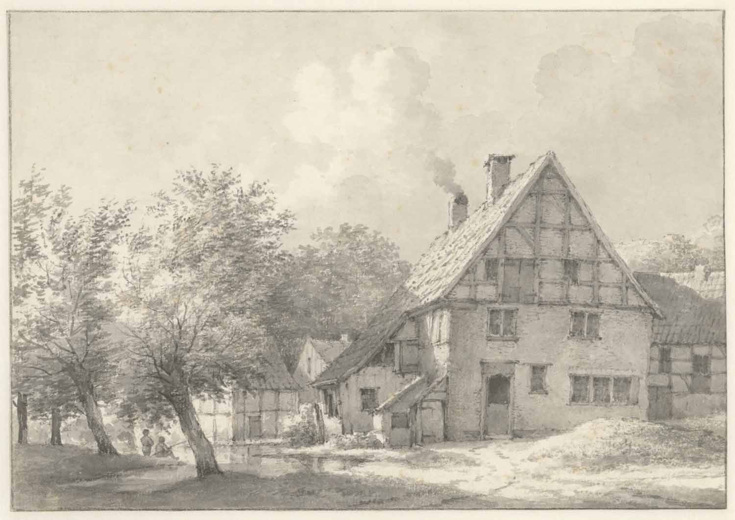 Boerenwoningen aan eene rivier, bij avondstond. Een ...