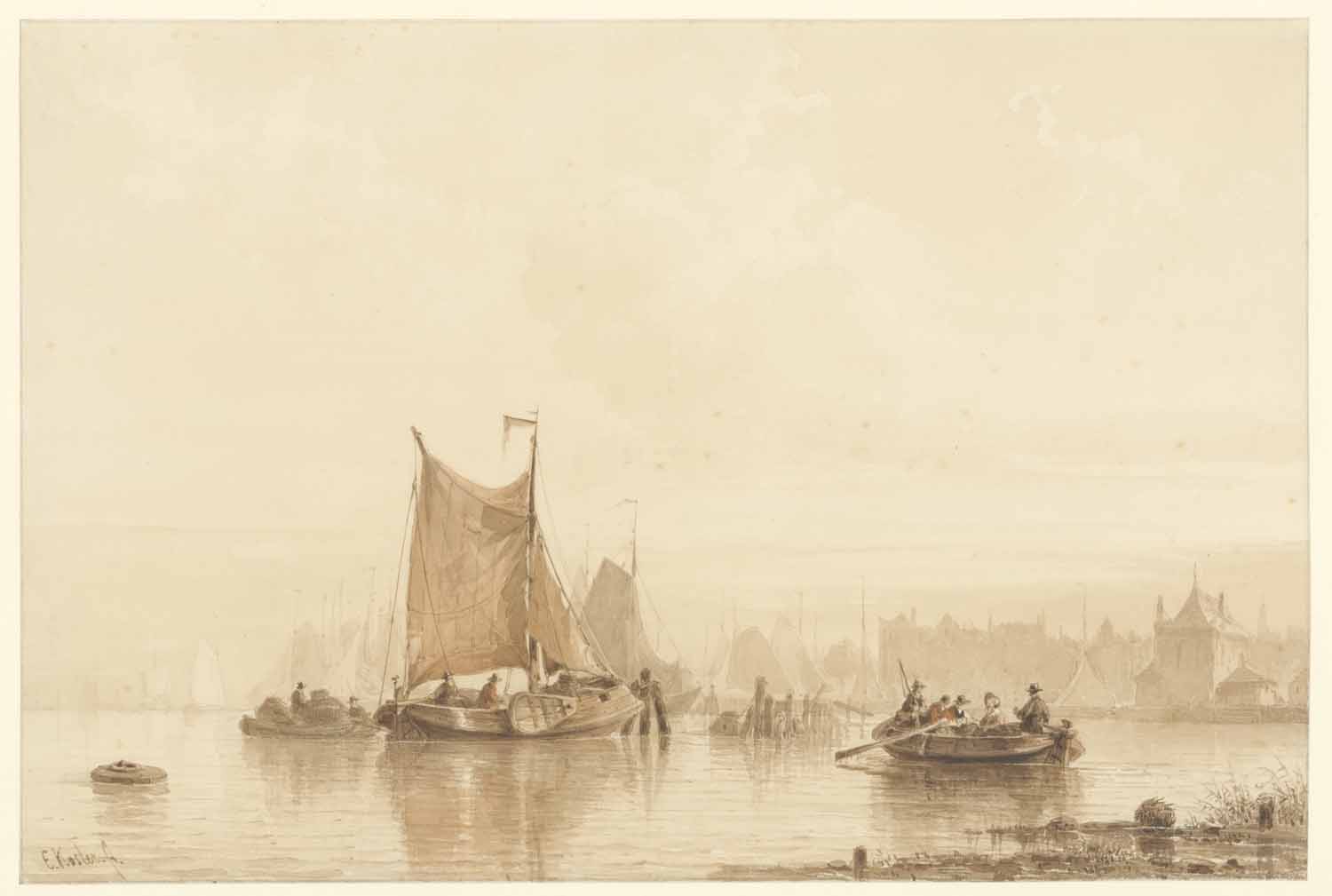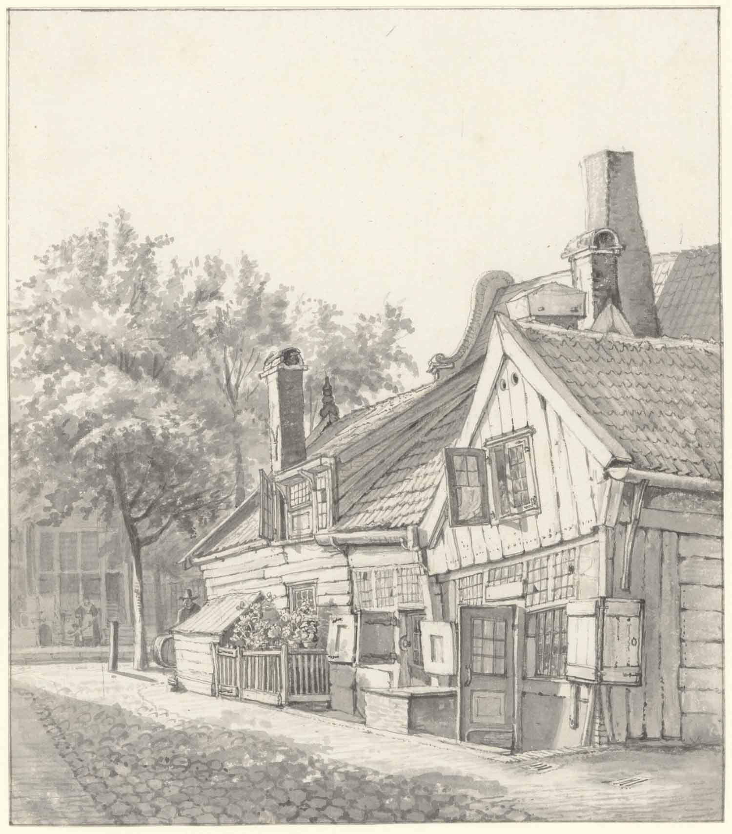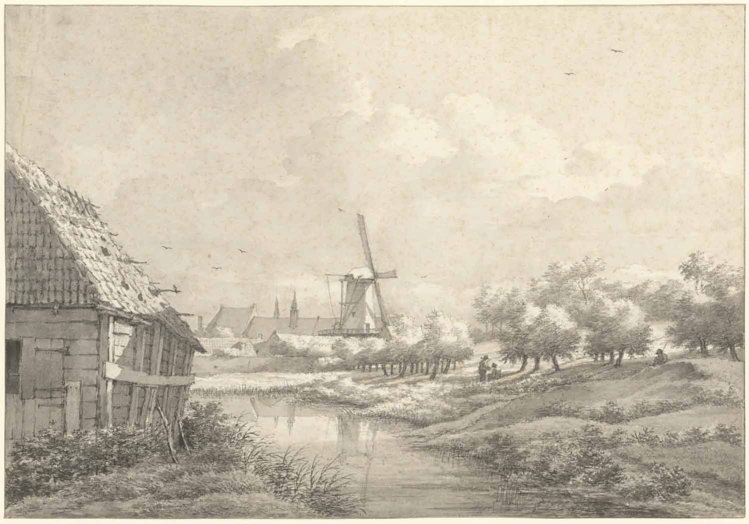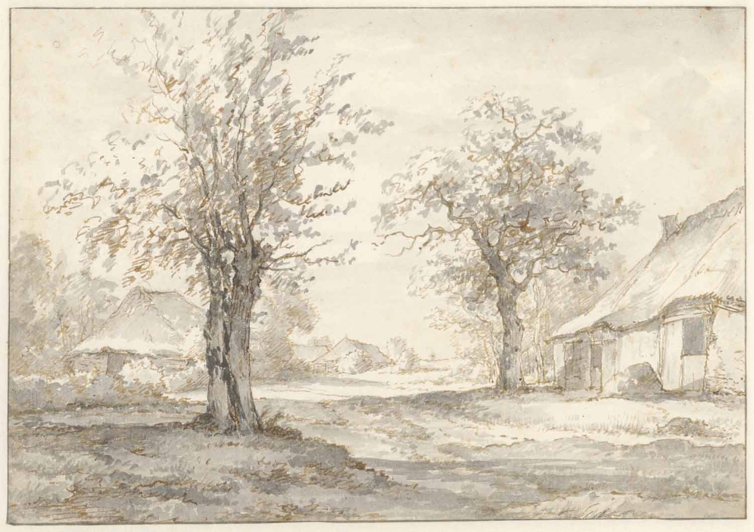 Boerenwoningen aan eene rivier, bij avondstond. Een ...