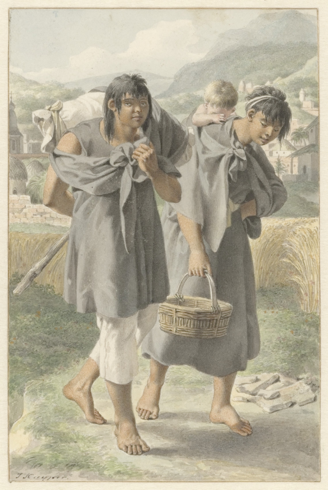 Eene Italiaansche vrouw houdt een kind voor het raam...