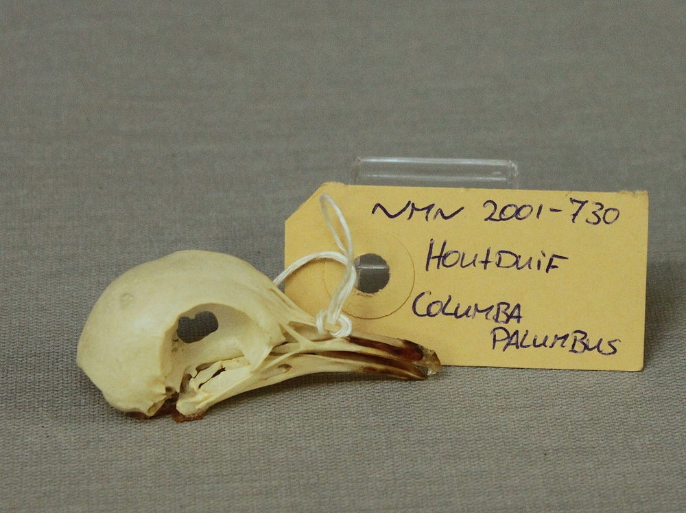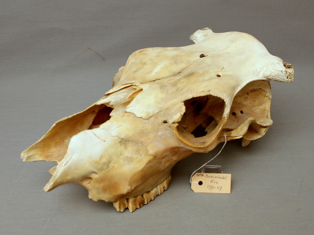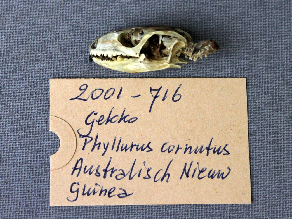 Hoornbladstaartgekko; schedel met enkele wervels; in...