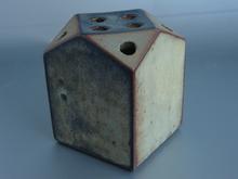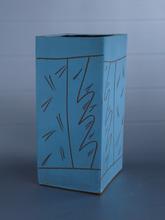 uit platen klei gevormde vierkante vaas met decoratie