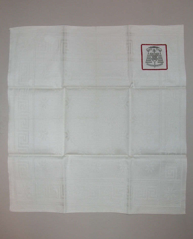 Kelkdoek met brede kantrand en geborduurd rood kruisje
