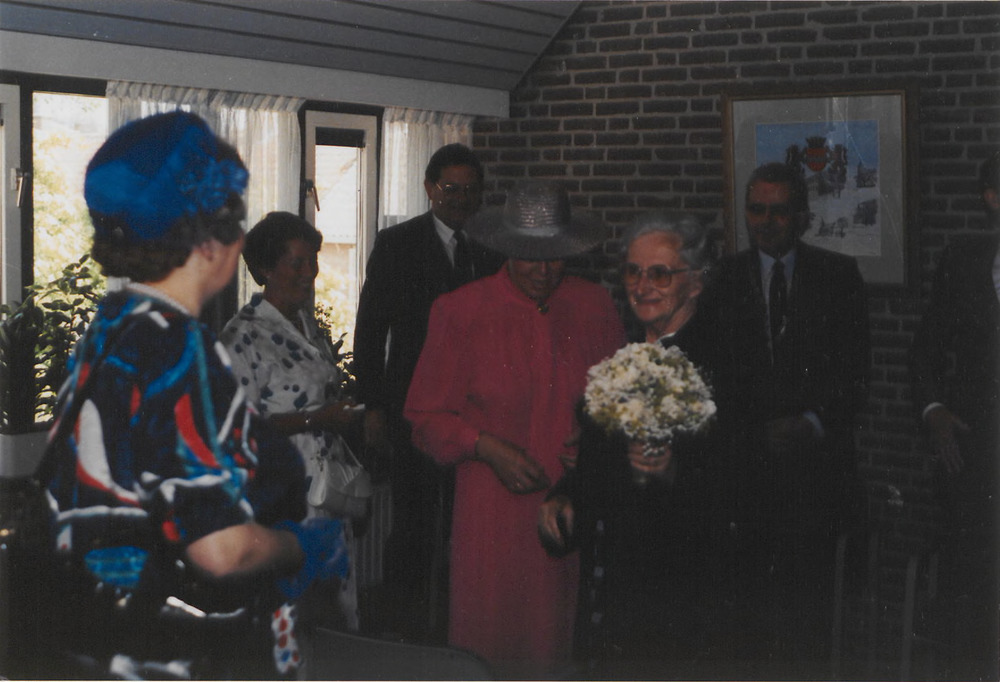 Bezoek prinses Beatrix aan het weeshuis, bloemen wor...