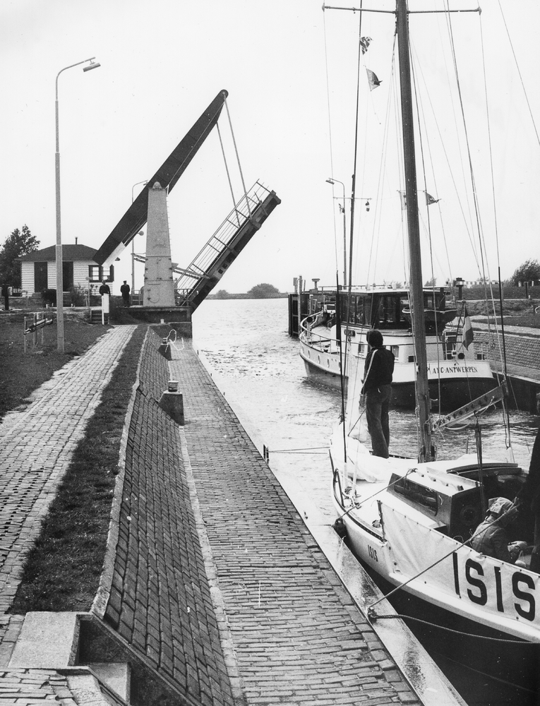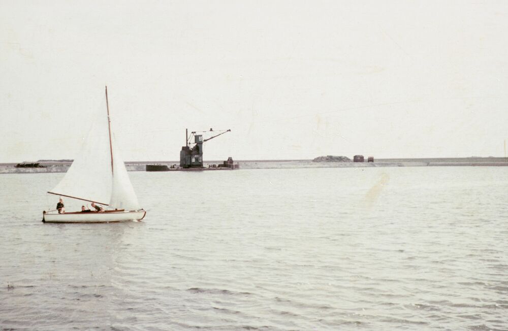 Een zeilscheepje vaart langs de nieuwe polderdijk