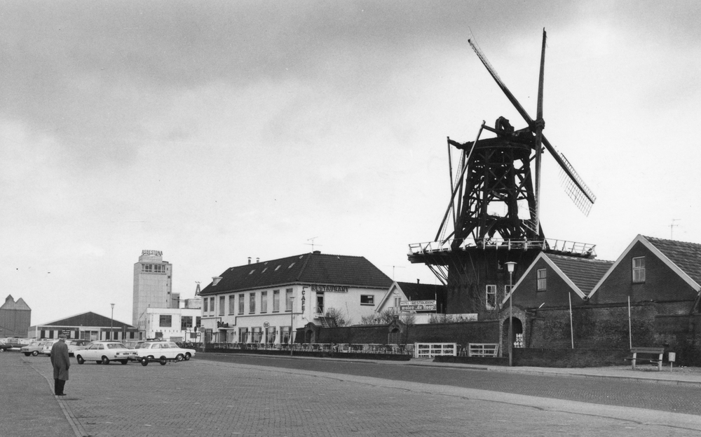Strandboulevard met uitgebrande molen De Hoop