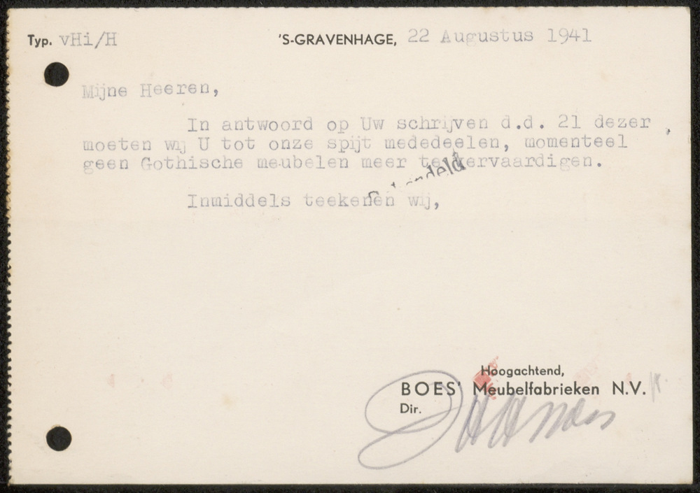 Briefkaart van de firma Boes Meubelfabrieken N.V. 's...