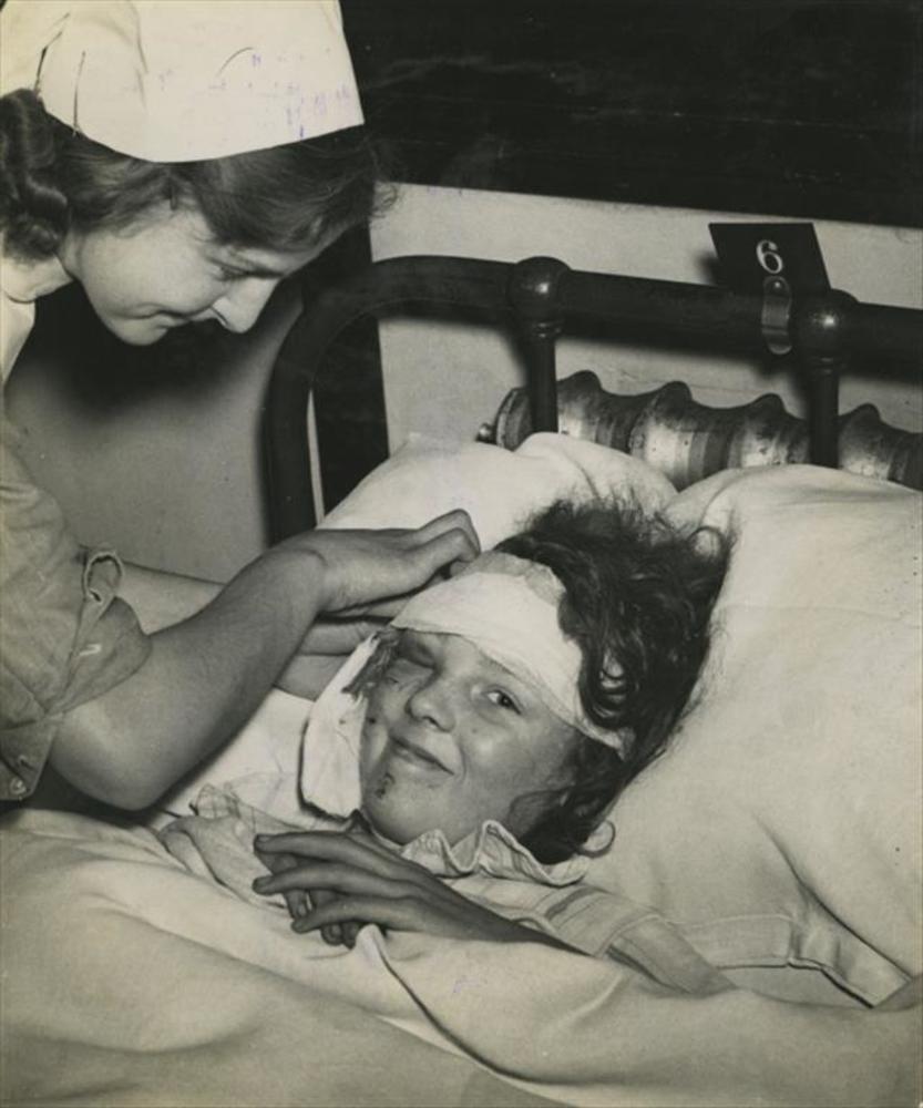 kind met verbonden hoofdwond in een hospitaal bed
