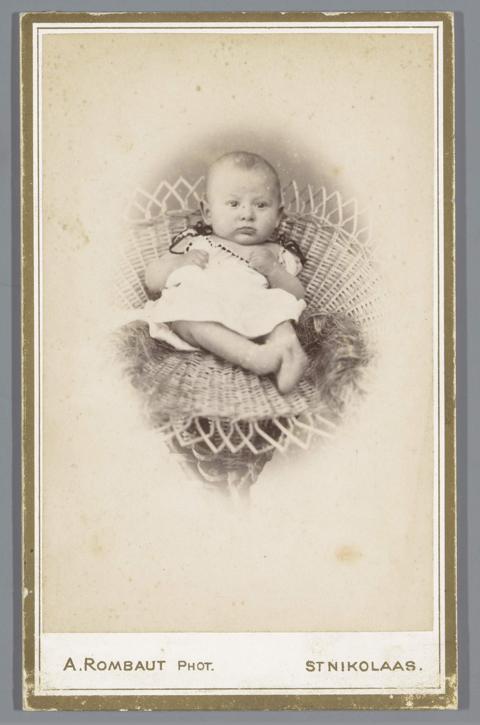 Portret van een onbekende baby in een rieten mand