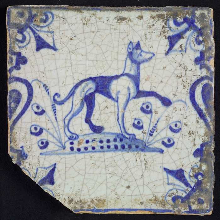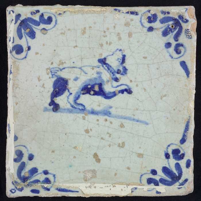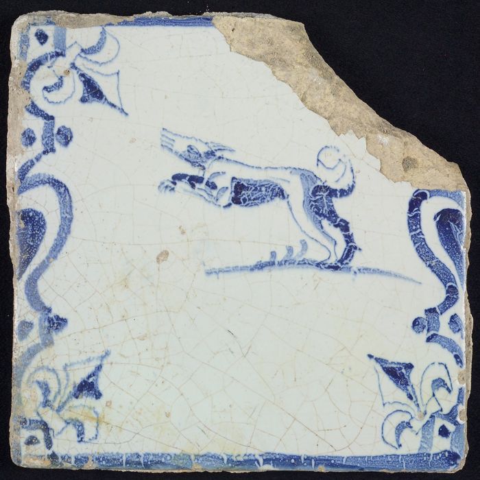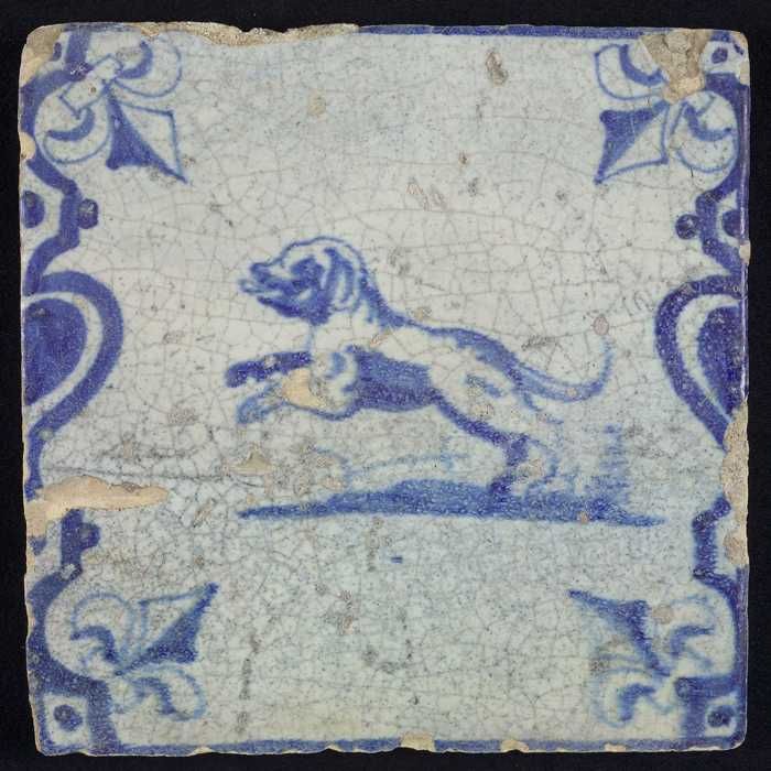 Dierentegel, rennende hond met accolades, hoekmotief...