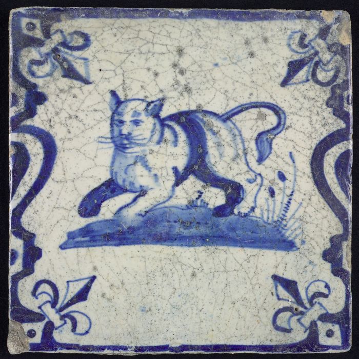 Dierentegel, lopende leeuwin of kat, tussen baluster...
