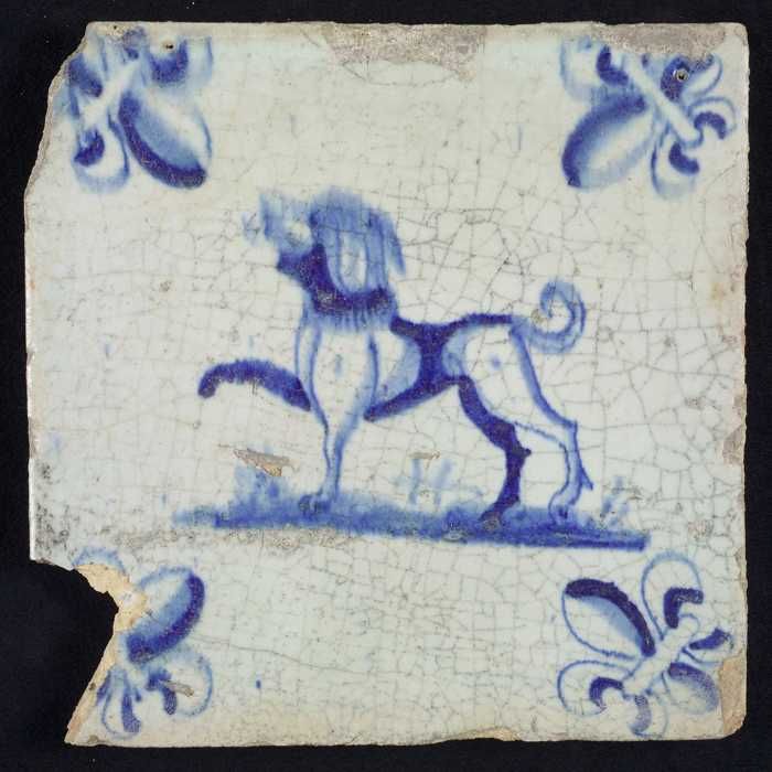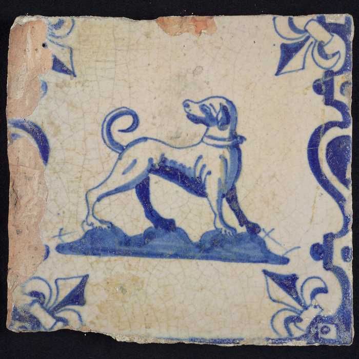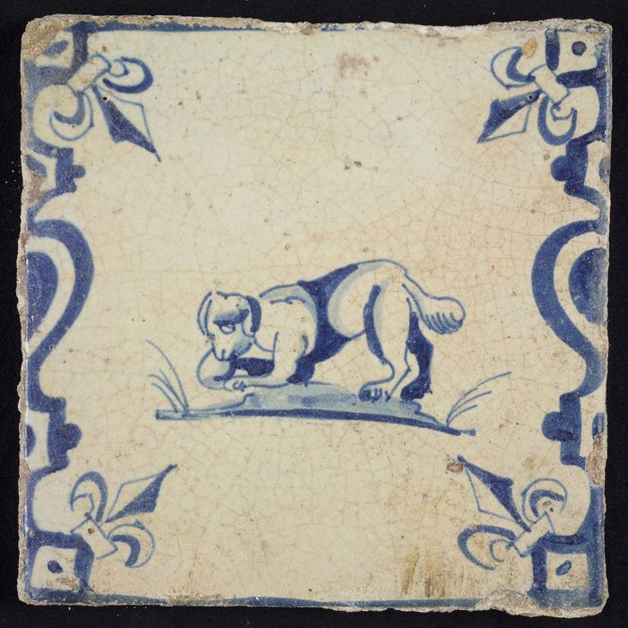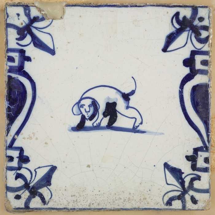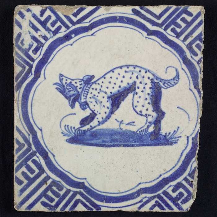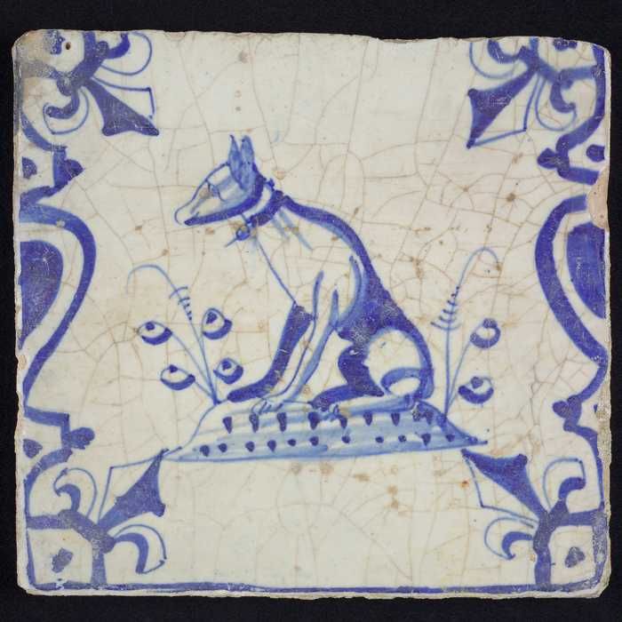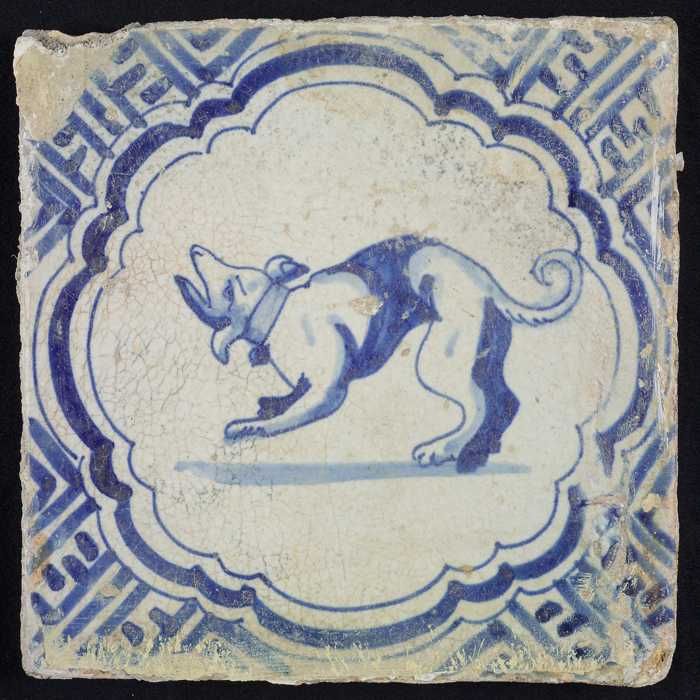 Dierentegel, zittende hond, in accolades, hoekmotief...