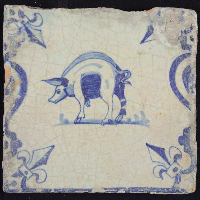 Dierentegel, staand varken tussen balusters, hoekmot...