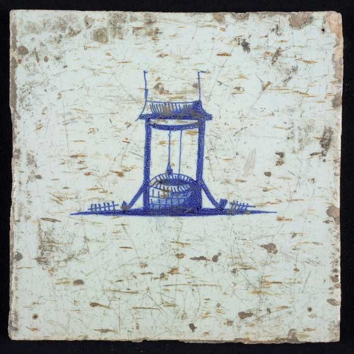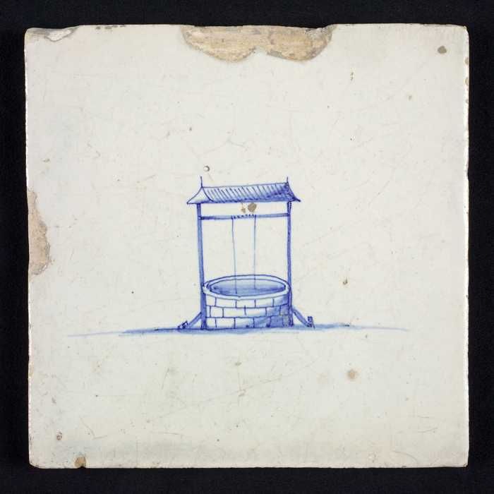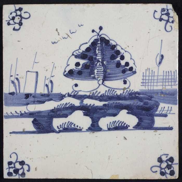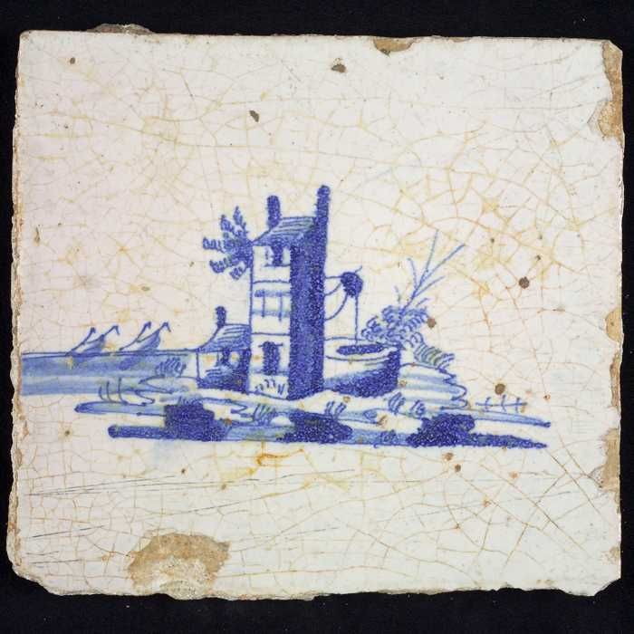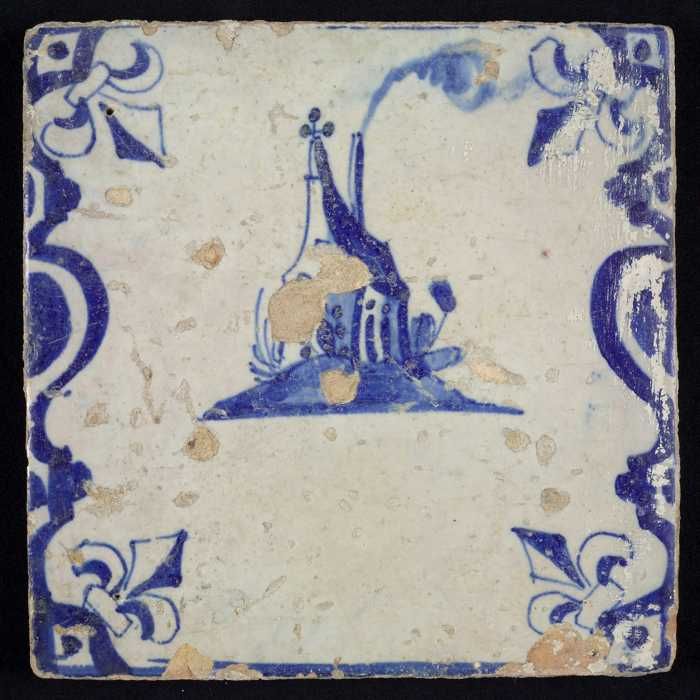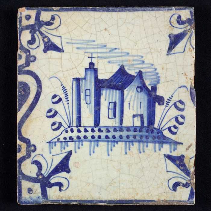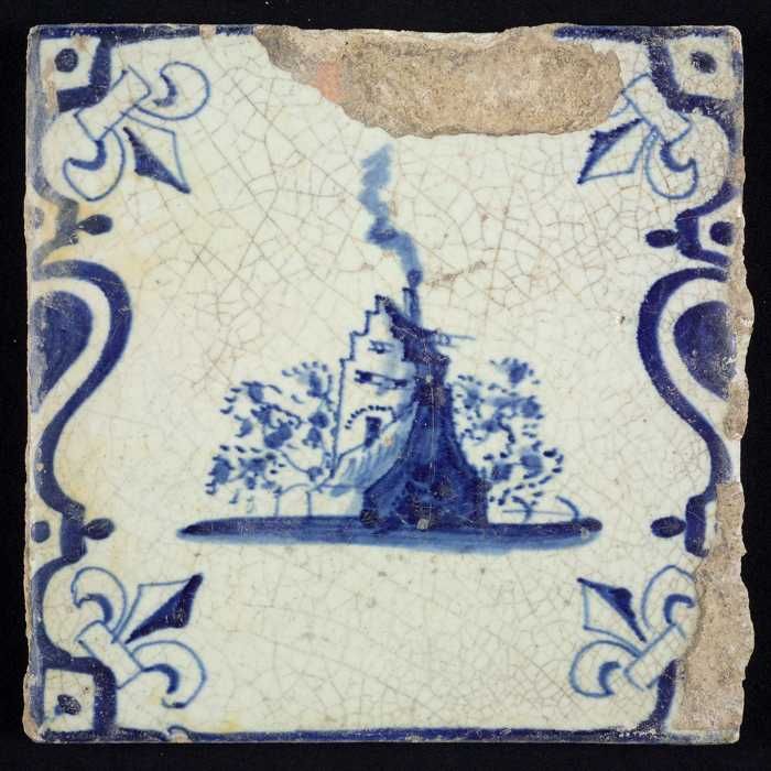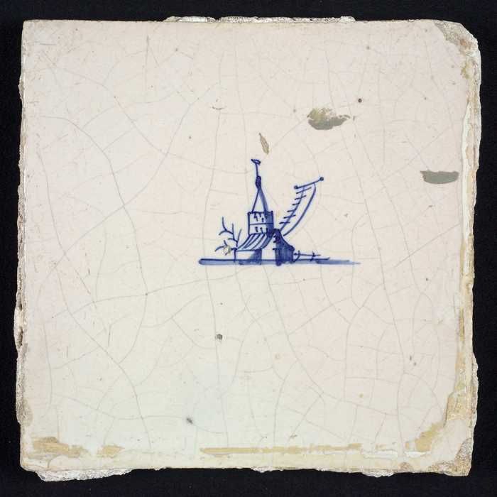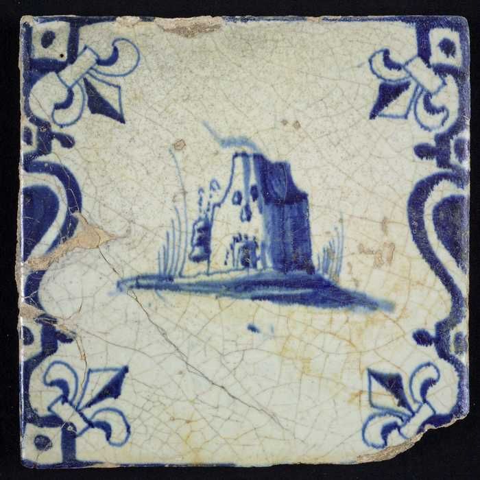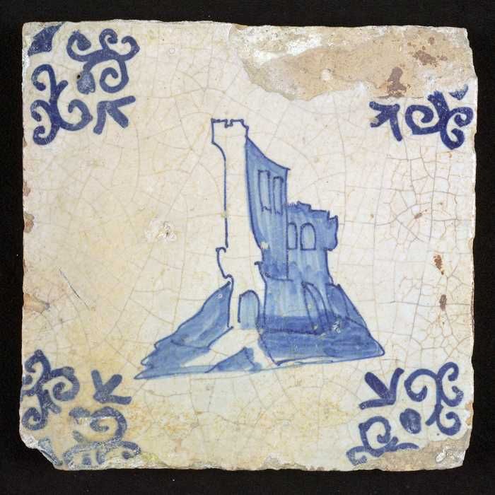 Tafereeltegel, blauw, ruïne, hoekmotief voluut