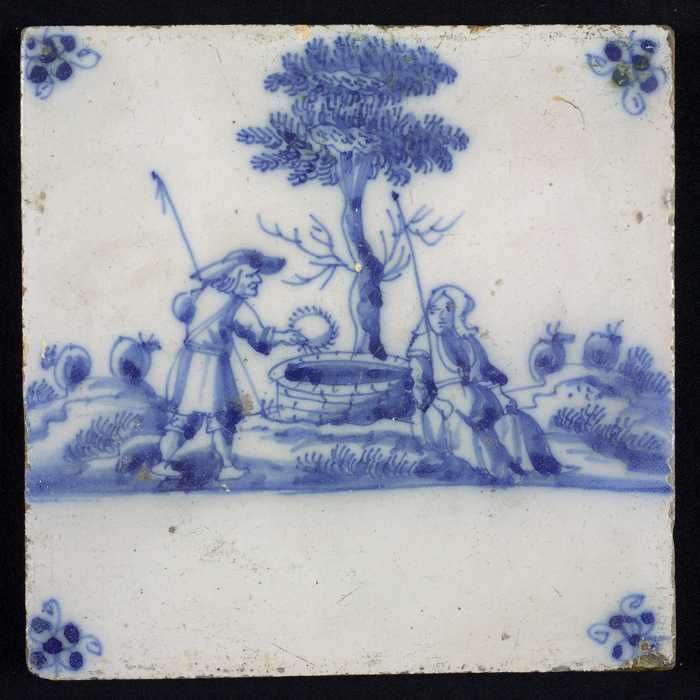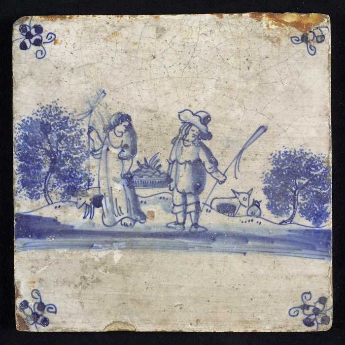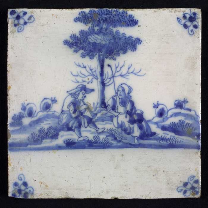 Tafereeltegel, blauw, herder en herderin, onder boom...