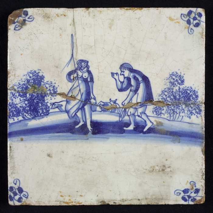Tafereeltegel, blauw, herder met jachthoorn, hoekmot...
