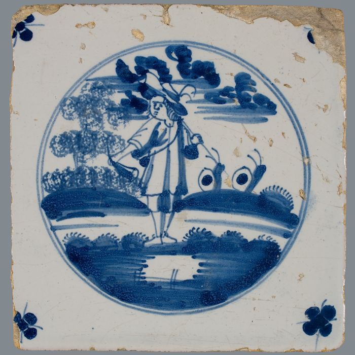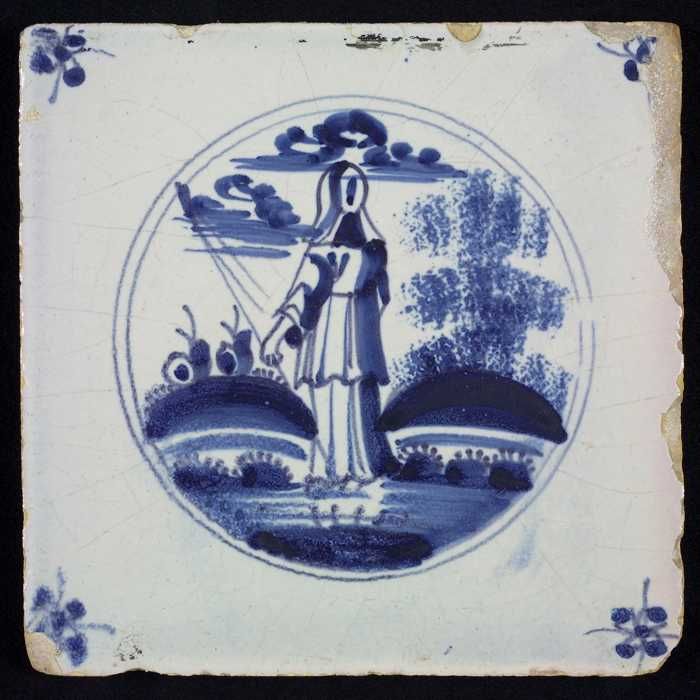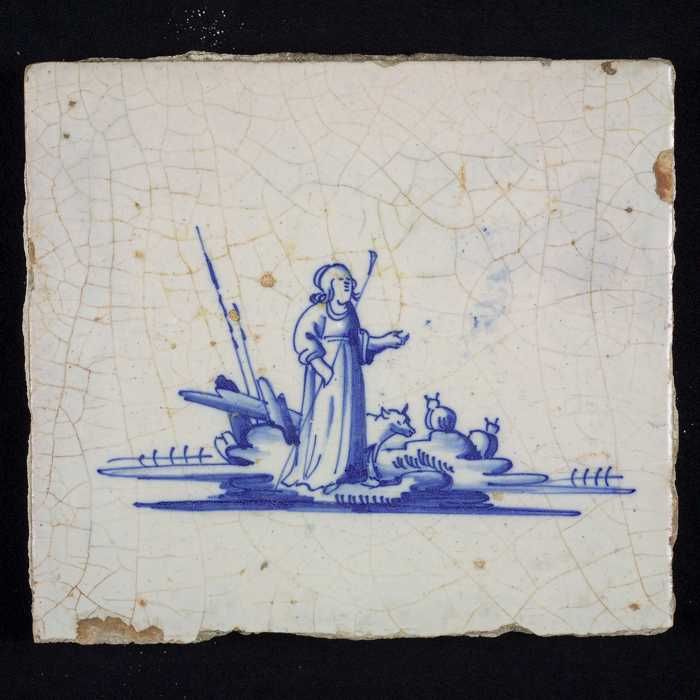 Figuurtegel, blauw, herder met staf, geen hoekmotief