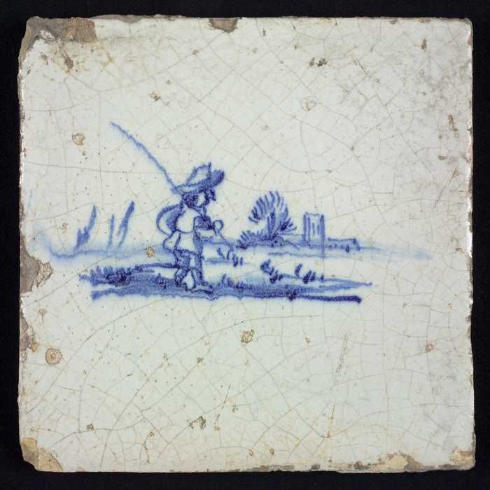 Tafereeltegel, blauw, visser met hengel in een lands...