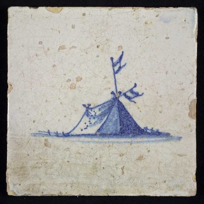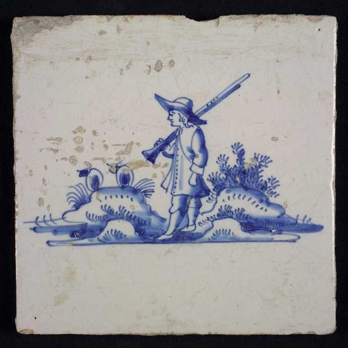 Tafereeltegel, blauw, jager met geweer in landschap,...