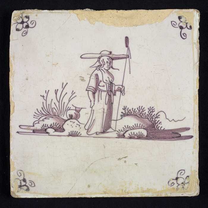 Tafereeltegel, paars, herderin met zonnehoed in een ...