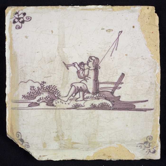 Tafereeltegel, paars, herder met fluit (?) in landsc...