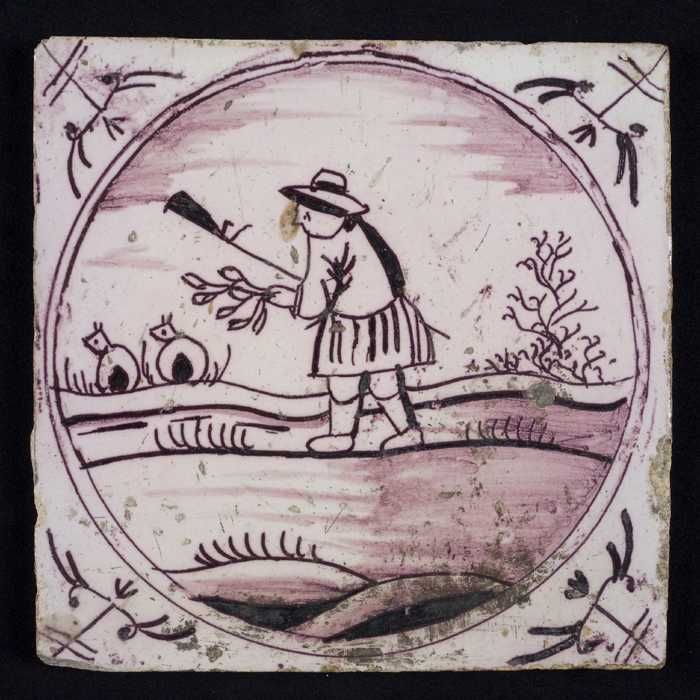 Tafereeltegel, paars, herder met tak en hark, hoekmo...