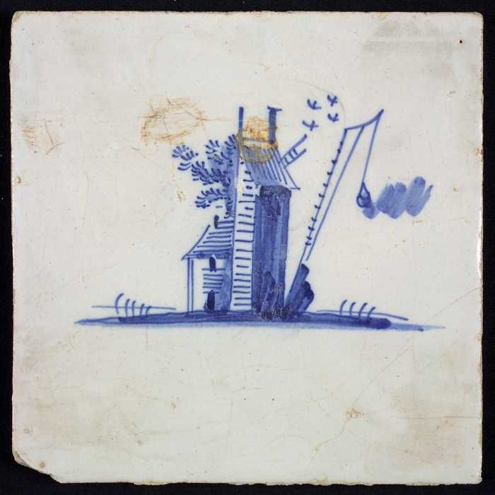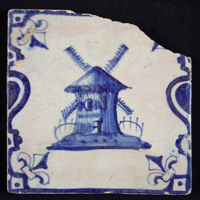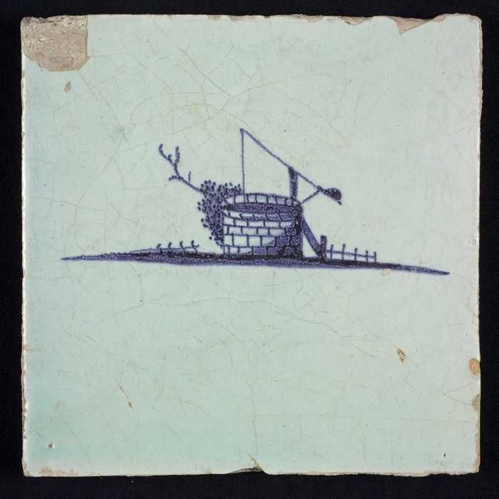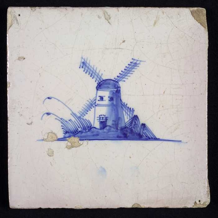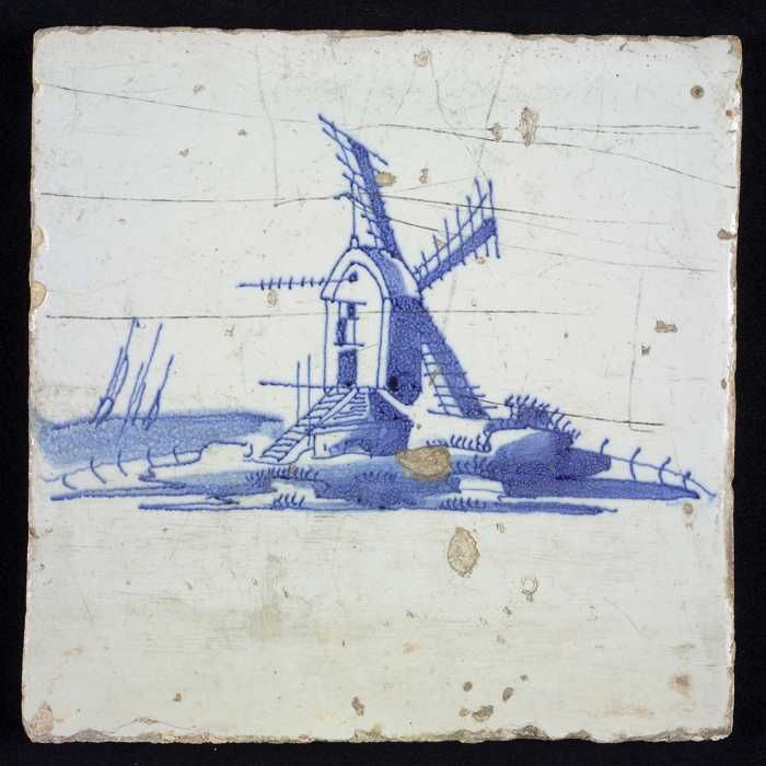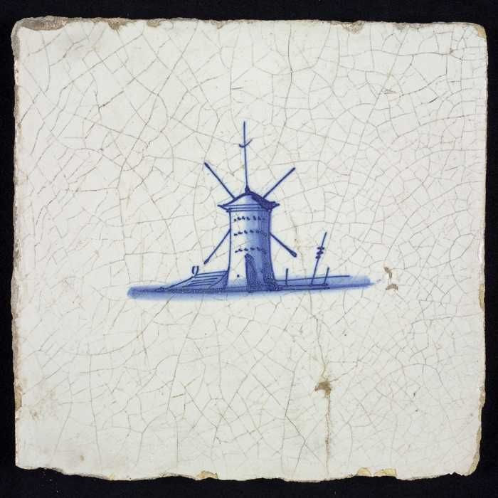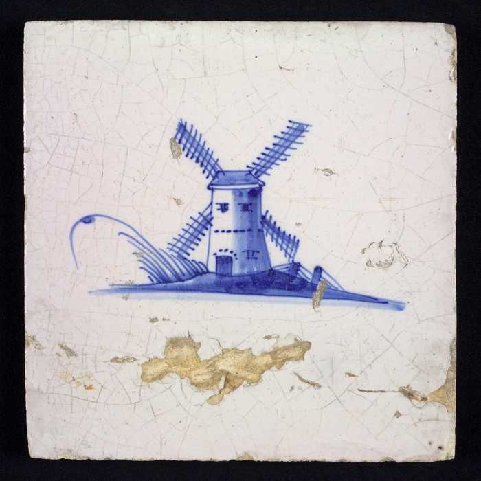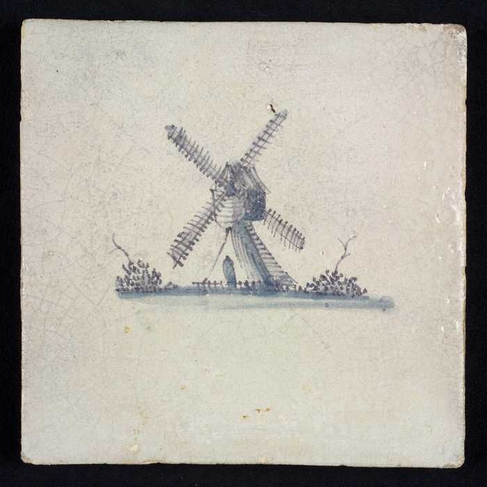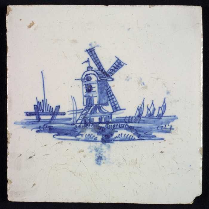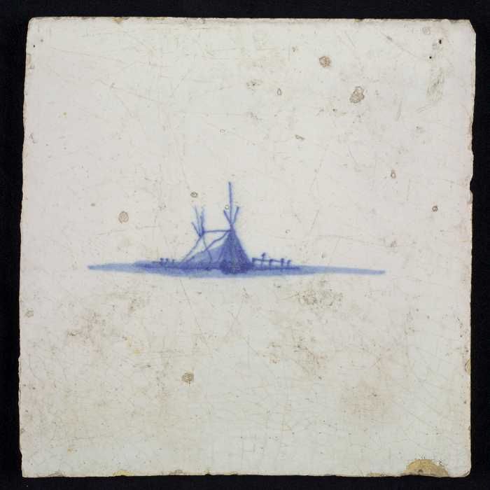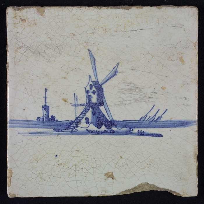 Tafereeltegel, blauw, landschap met molen, tussen ba...