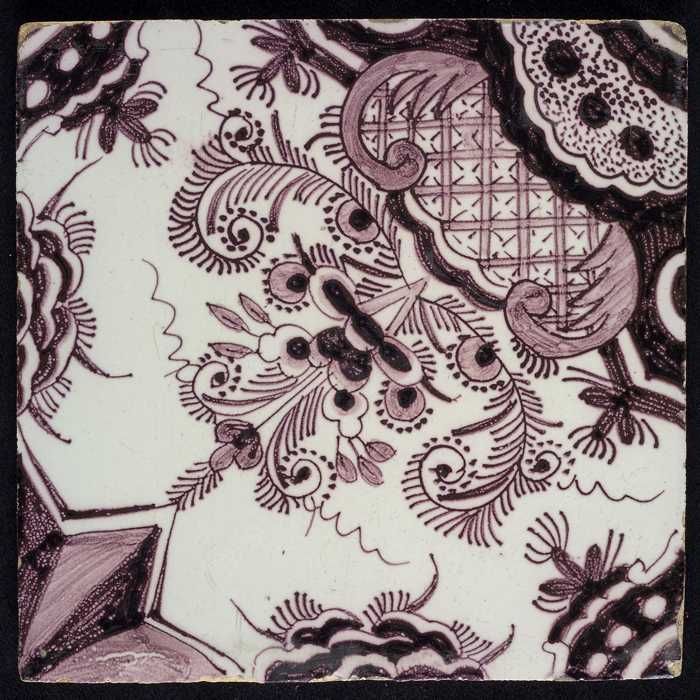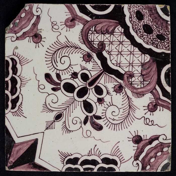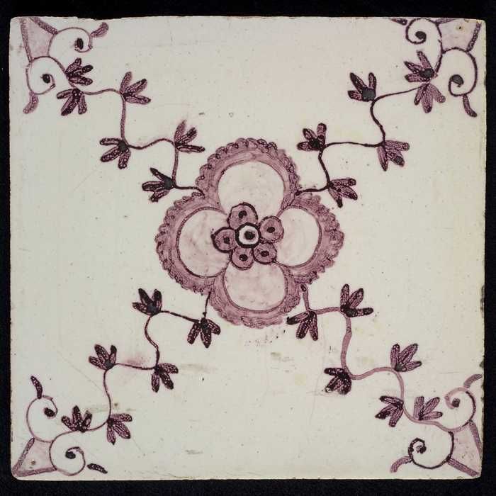 Ornamenttegel, rozet met bloemhart, hoekmotief ossenkop