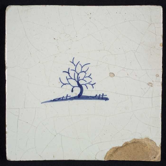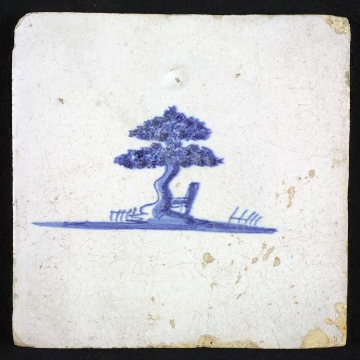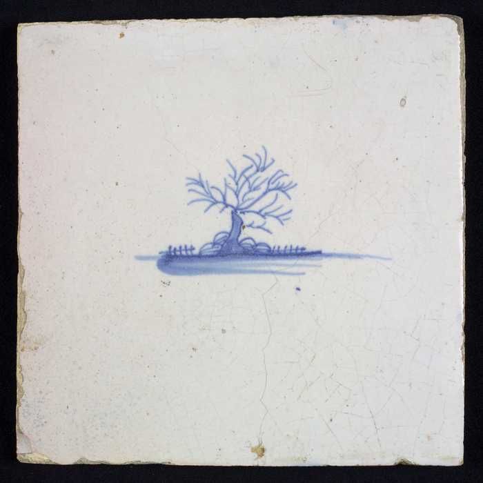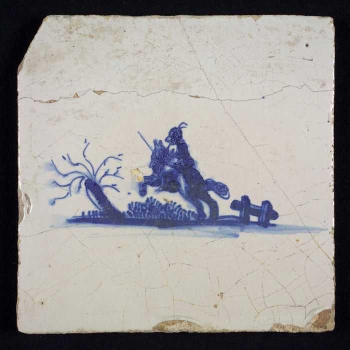 Tafereeltegel, blauw, ruiter bij kale boom en hek, g...