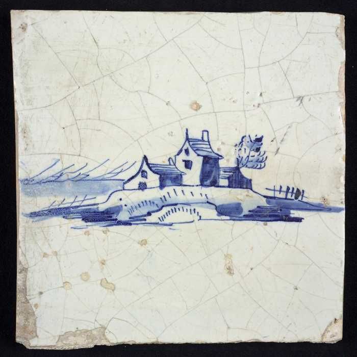 Tafereeltegel, blauw, huis met rookpluim, tussen bal...