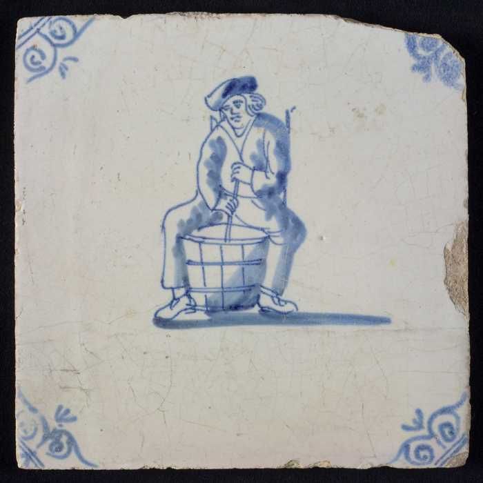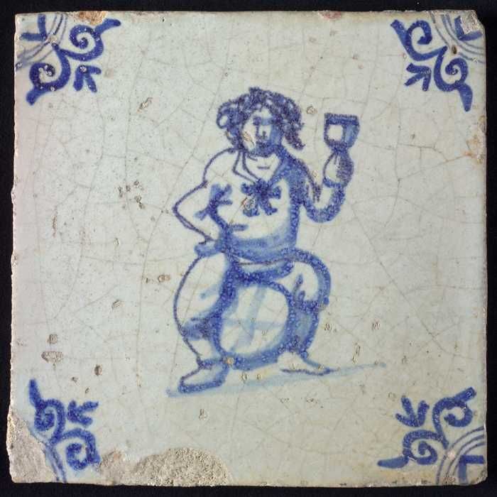 Figuurtegel, blauw, man zittend op een vat, hoekmoti...