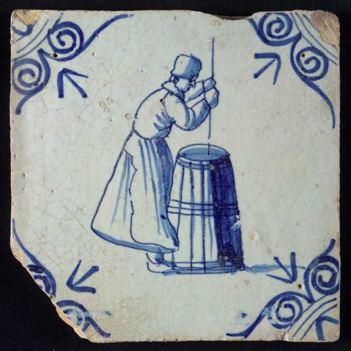 Figuurtegel, blauw, man met een stapel in de handen,...