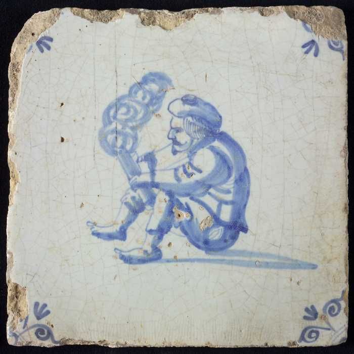 Figuurtegel, blauw, man met buizen op zijn rug, hoek...