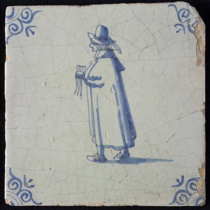 Figuurtegel, blauw, staande edelman met iets in de h...