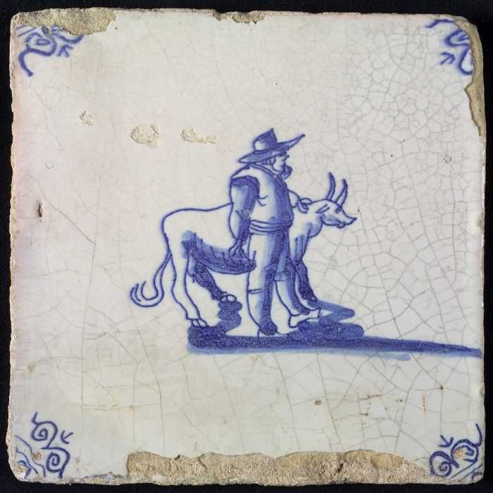 Figuurtegel, blauw, boer met een rund, hoekmotief os...