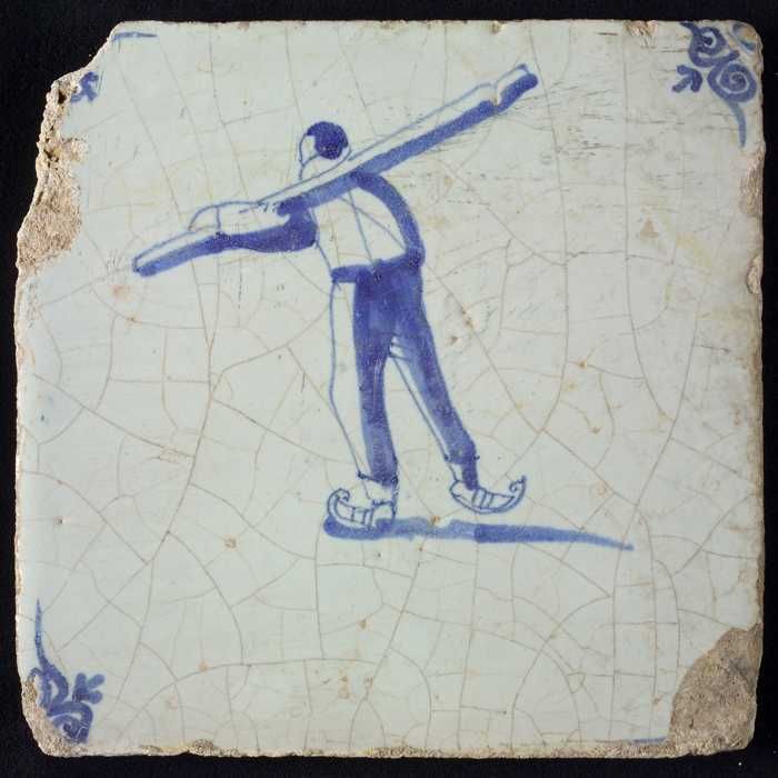 Figuurtegel, blauw, schaatsende man met balk op scho...