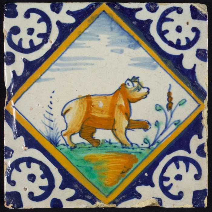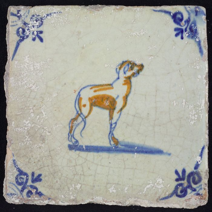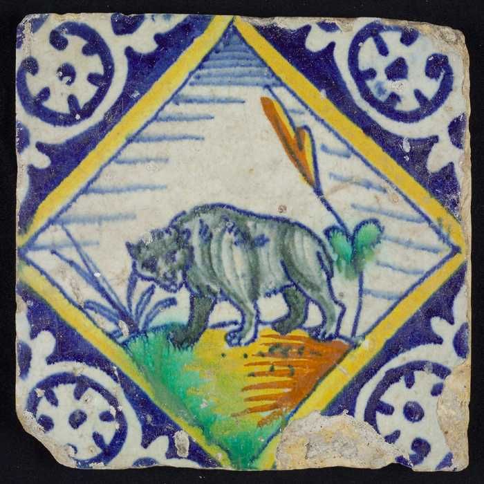Figuurtegel, figuur met vat, hoekmotief ossenkop