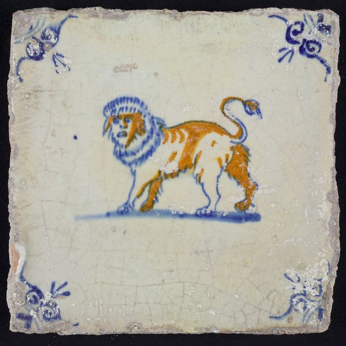 Figuurtegel, blauw, staande edelman, hoekmotief osse...