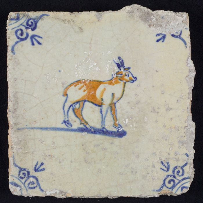 Dierentegel, hert met groot gewei, hoekmotief ossenkop