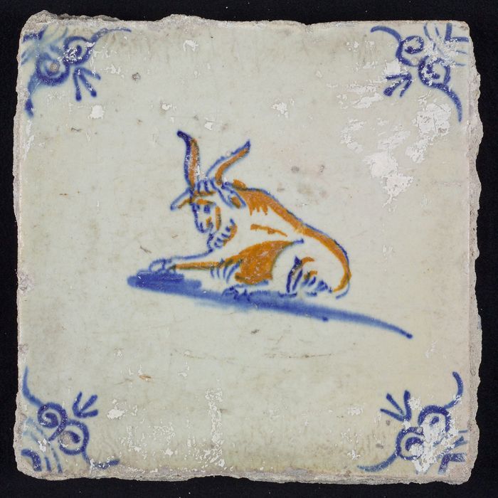 Dierentegel, bok op grondje, hoekmotief grote ossenkop