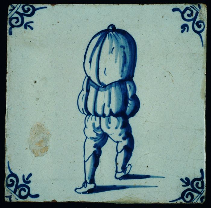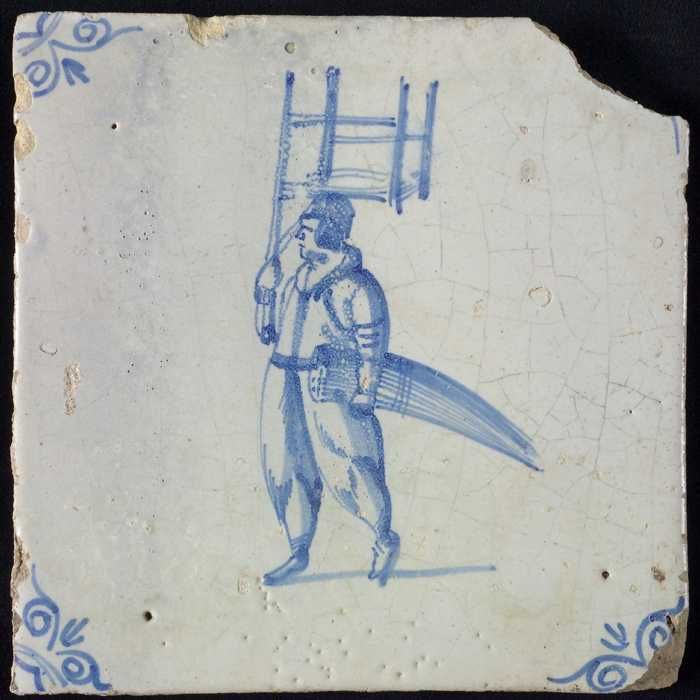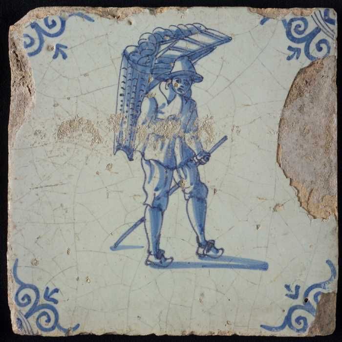 Figuurtegel, blauw, zakkendrager op de rug gezien, h...