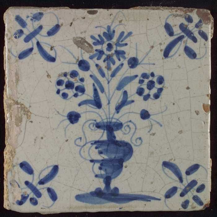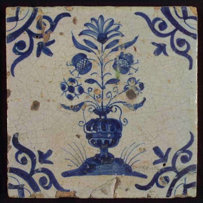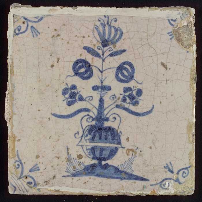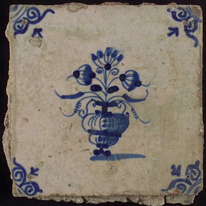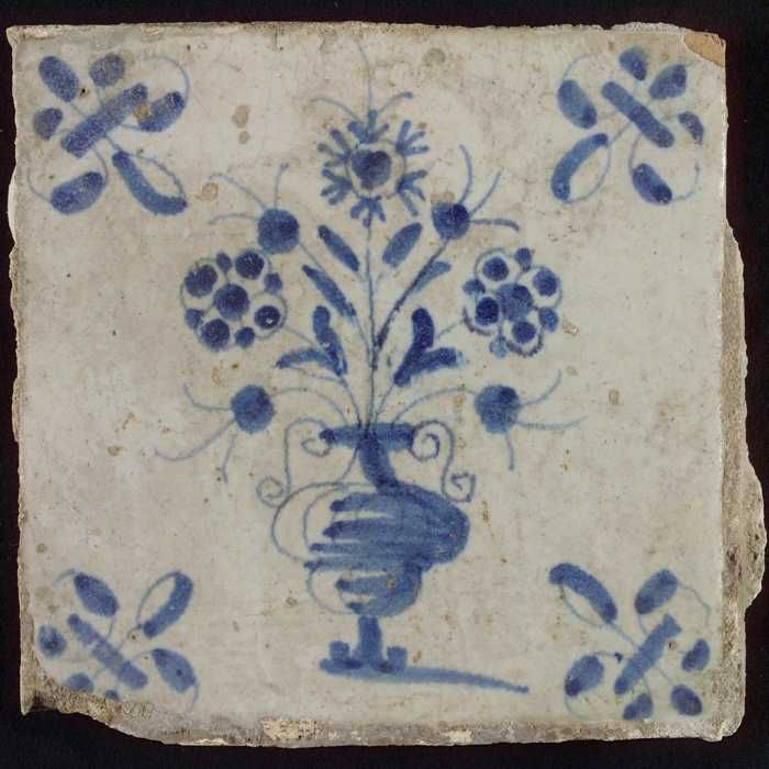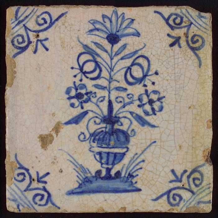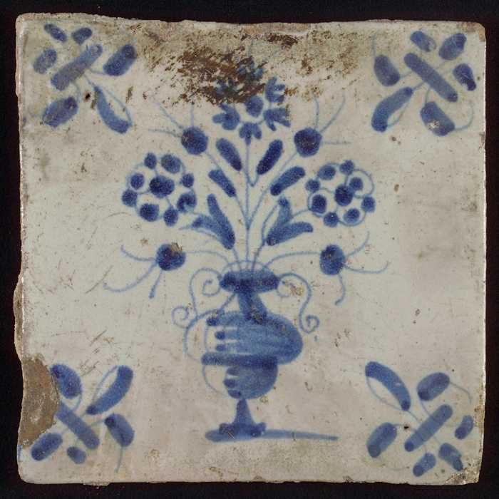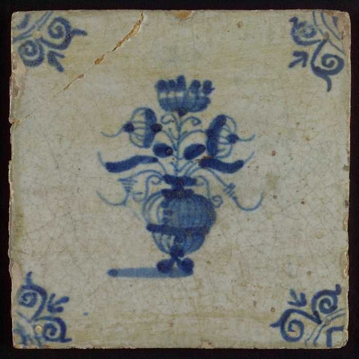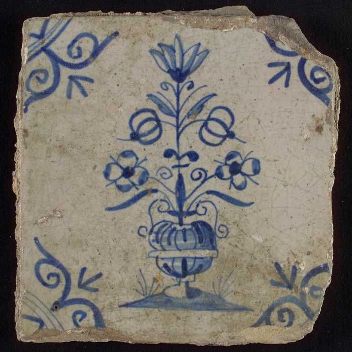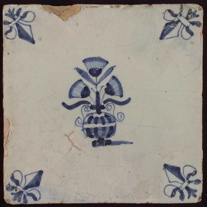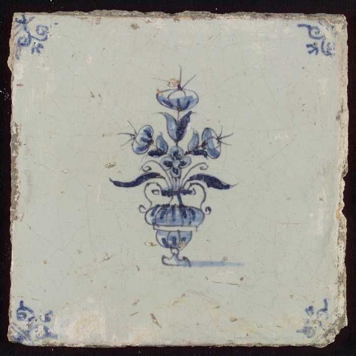 Tegel, bloempot in blauw op wit, hoekmotief gespaakt...