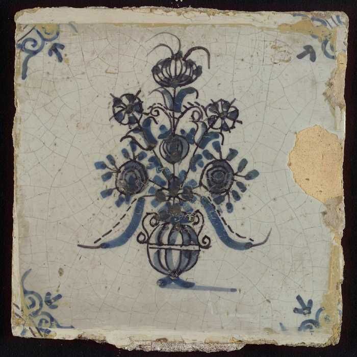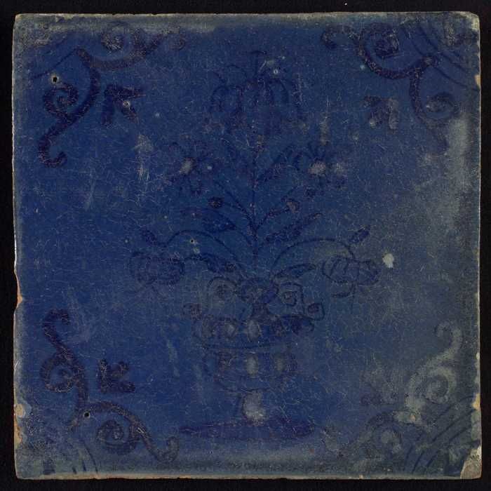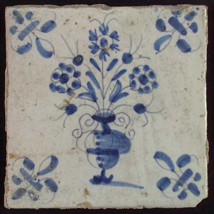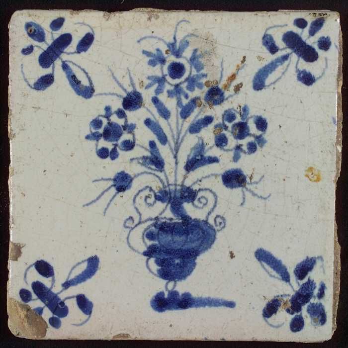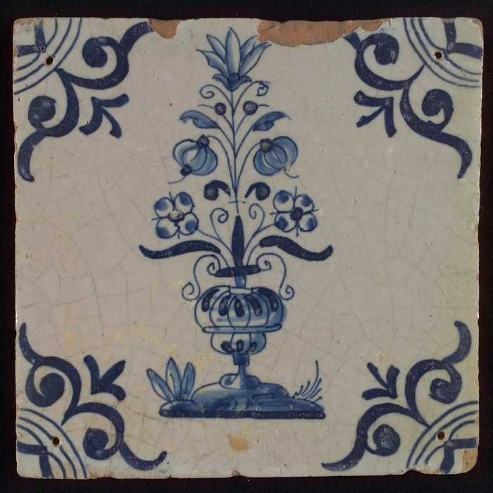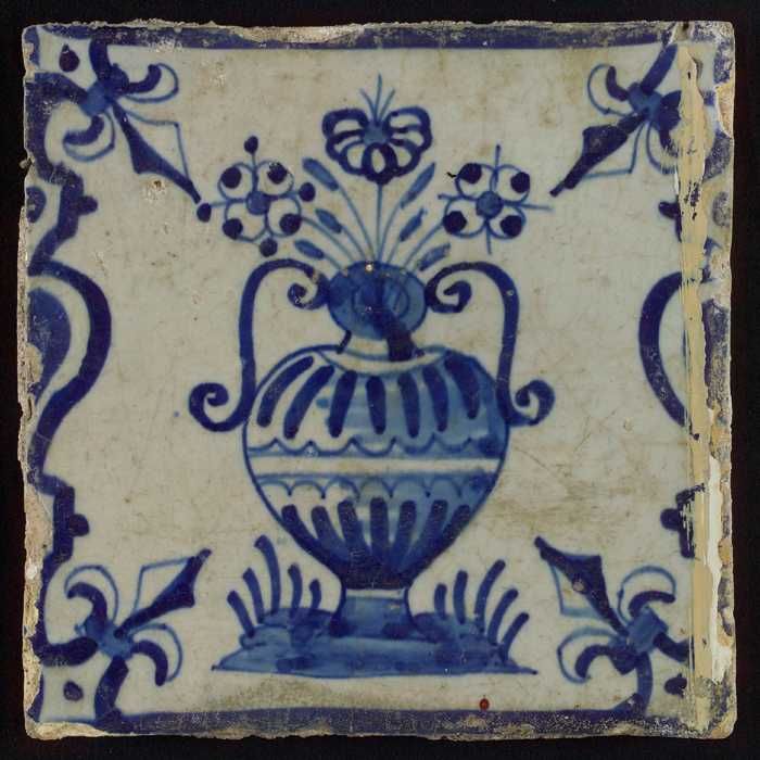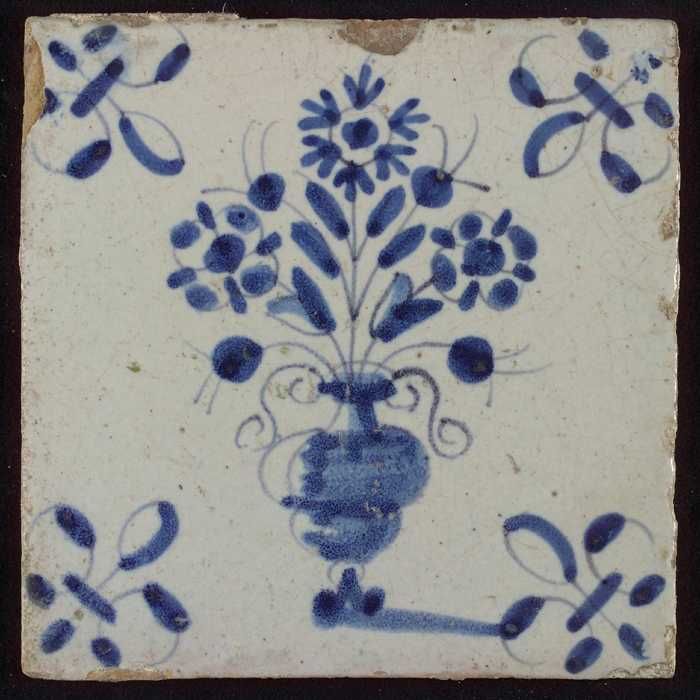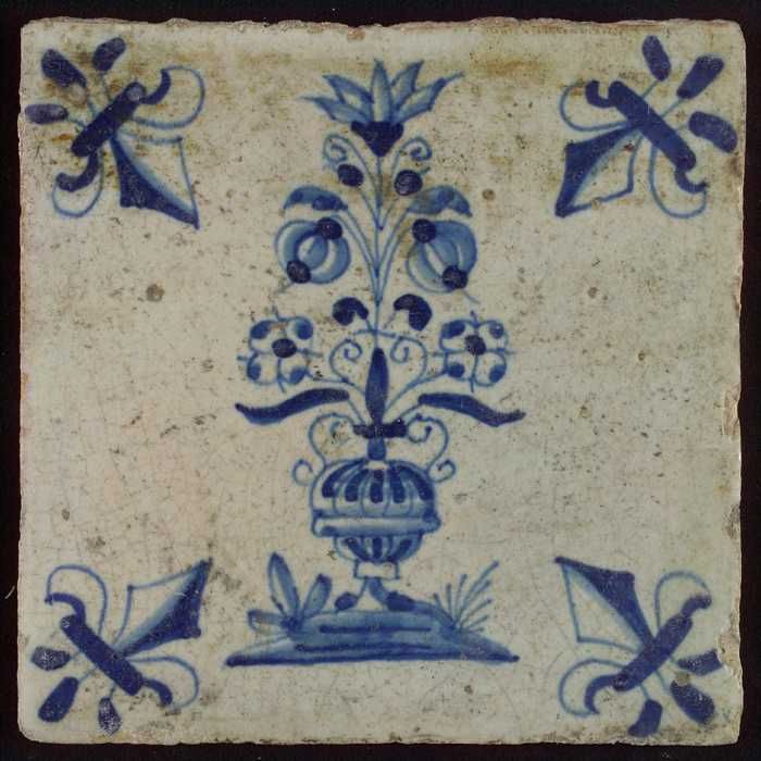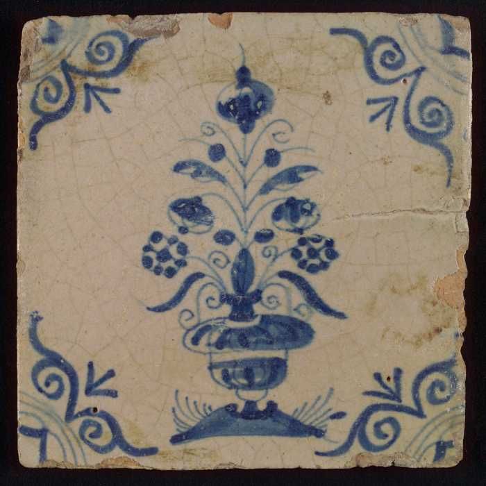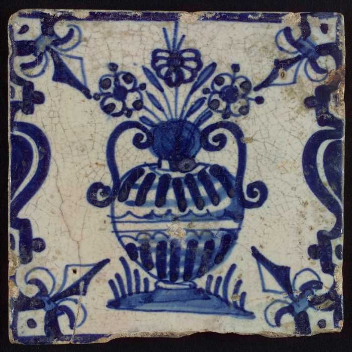 Tegel, bloempot in blauw op wit, hoekmotief gespaakt...