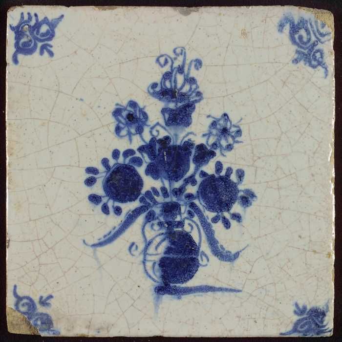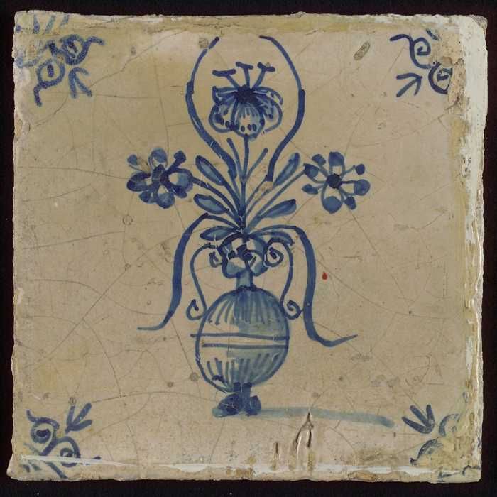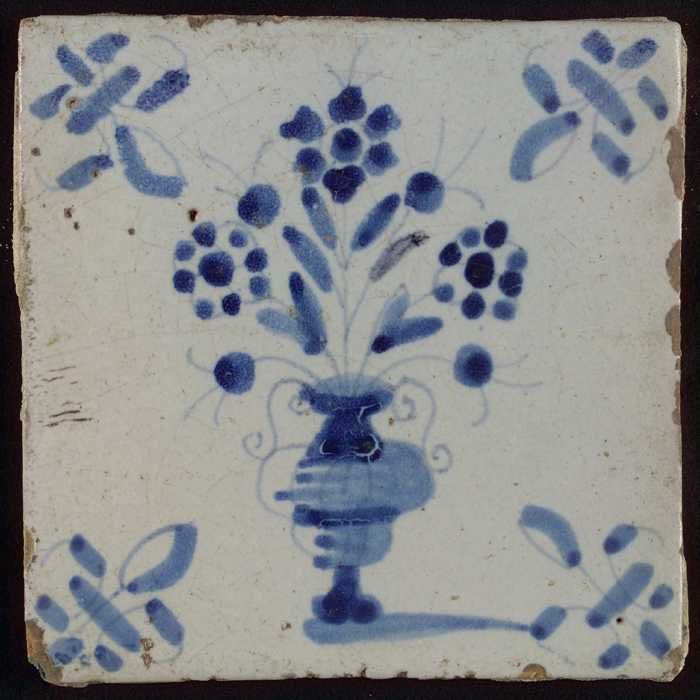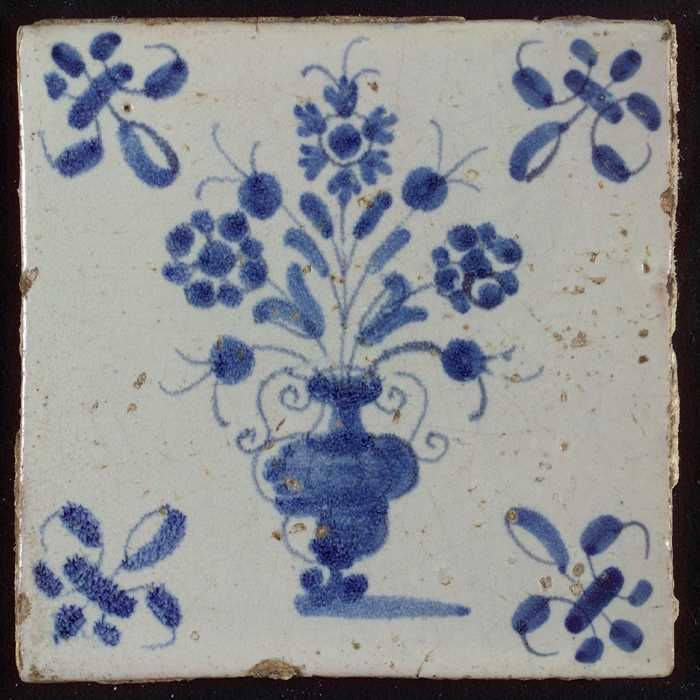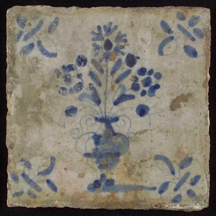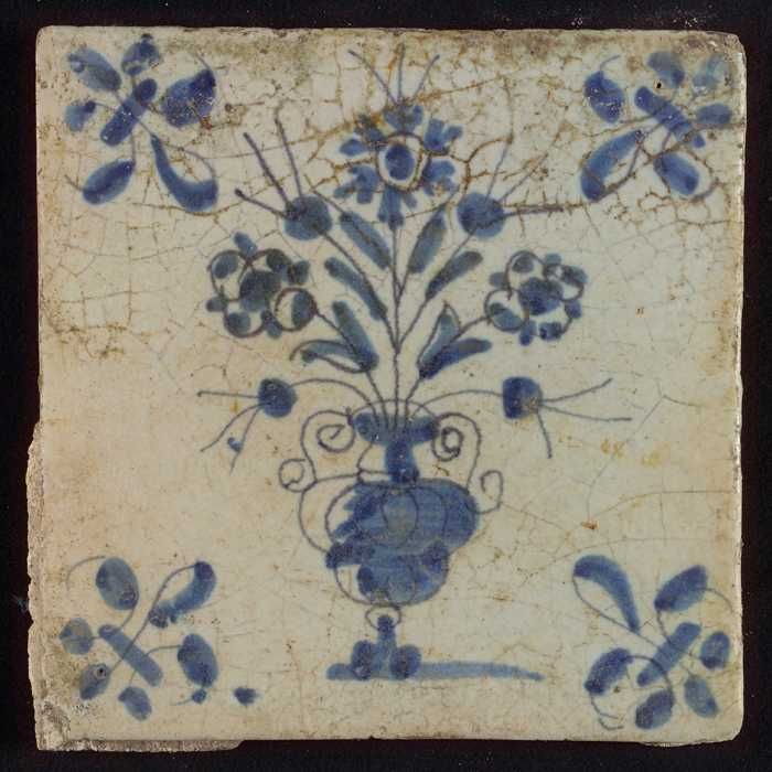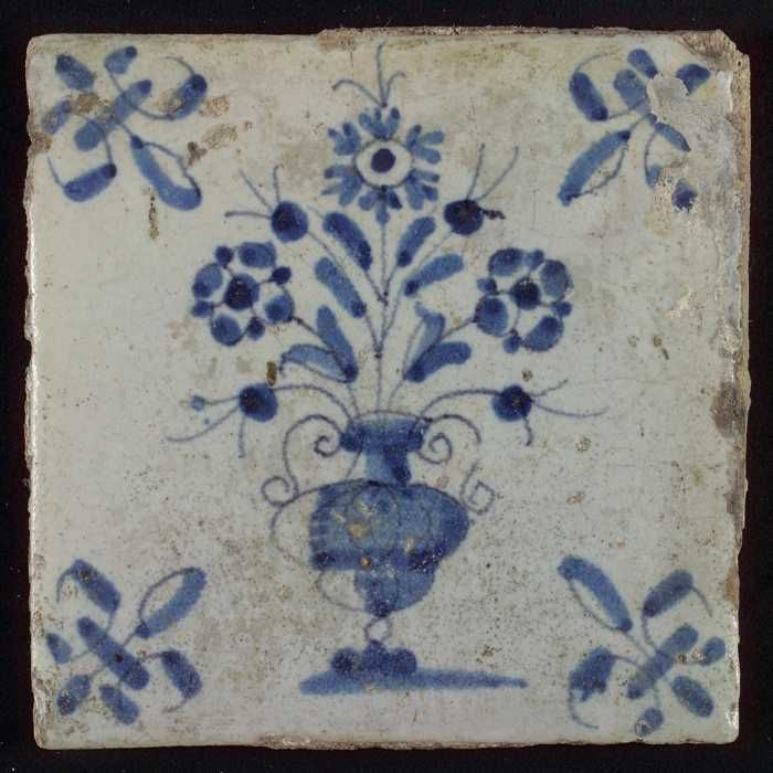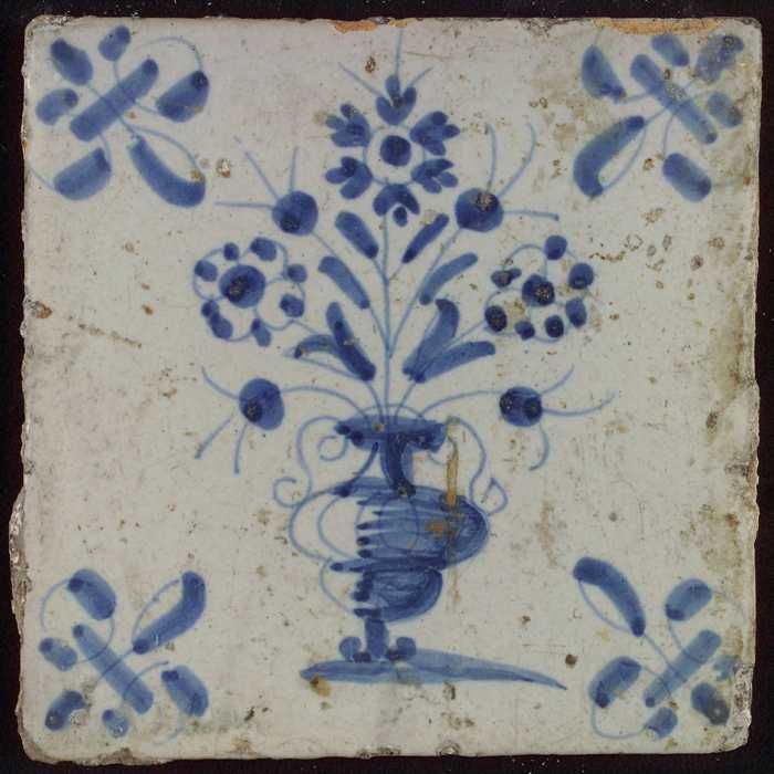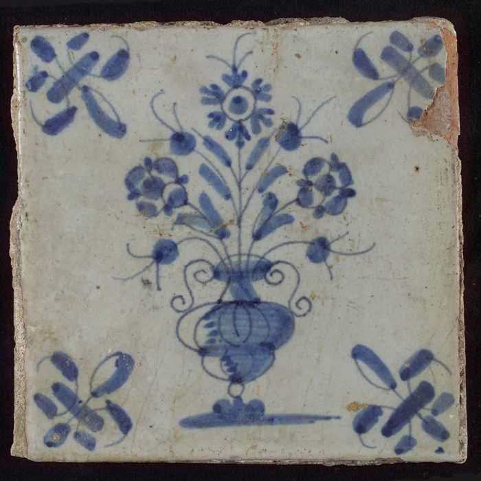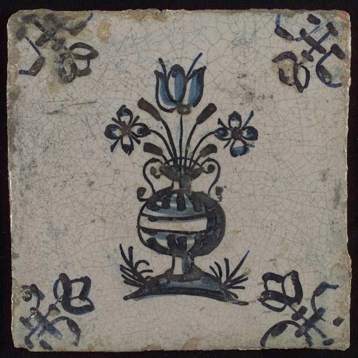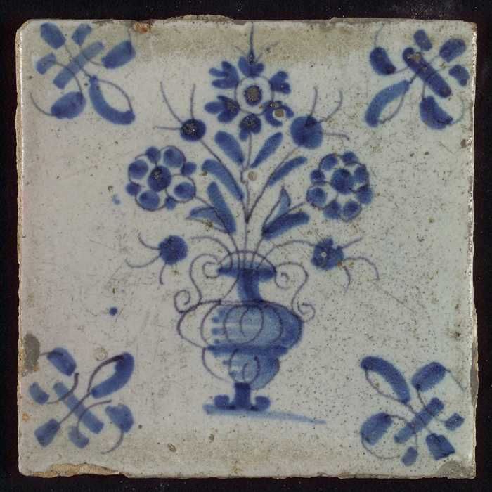 Tegel, bloempot in blauw op wit, hoekmotief gespaakt...